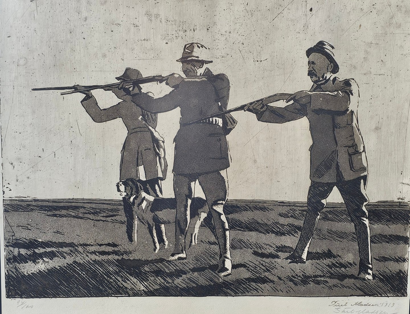 Litografi med motiv af tre jægere og en hund monteret i guldmalet træramme. Nr. 94/100, dateret 1919