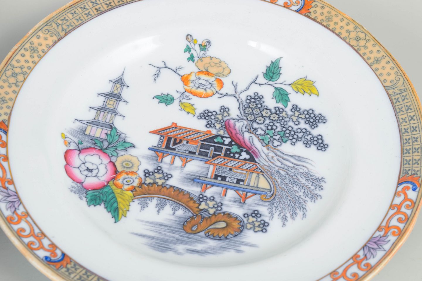 Dinner plates in faience with oriental-inspired decoration in polychrome colours and finely detailed painting in Japanese style, characteristic of Rörstrand’s japonisme production from the early 20th century.