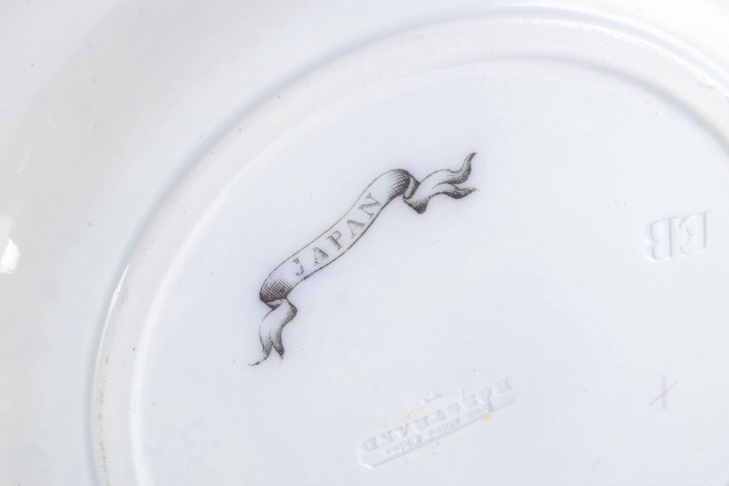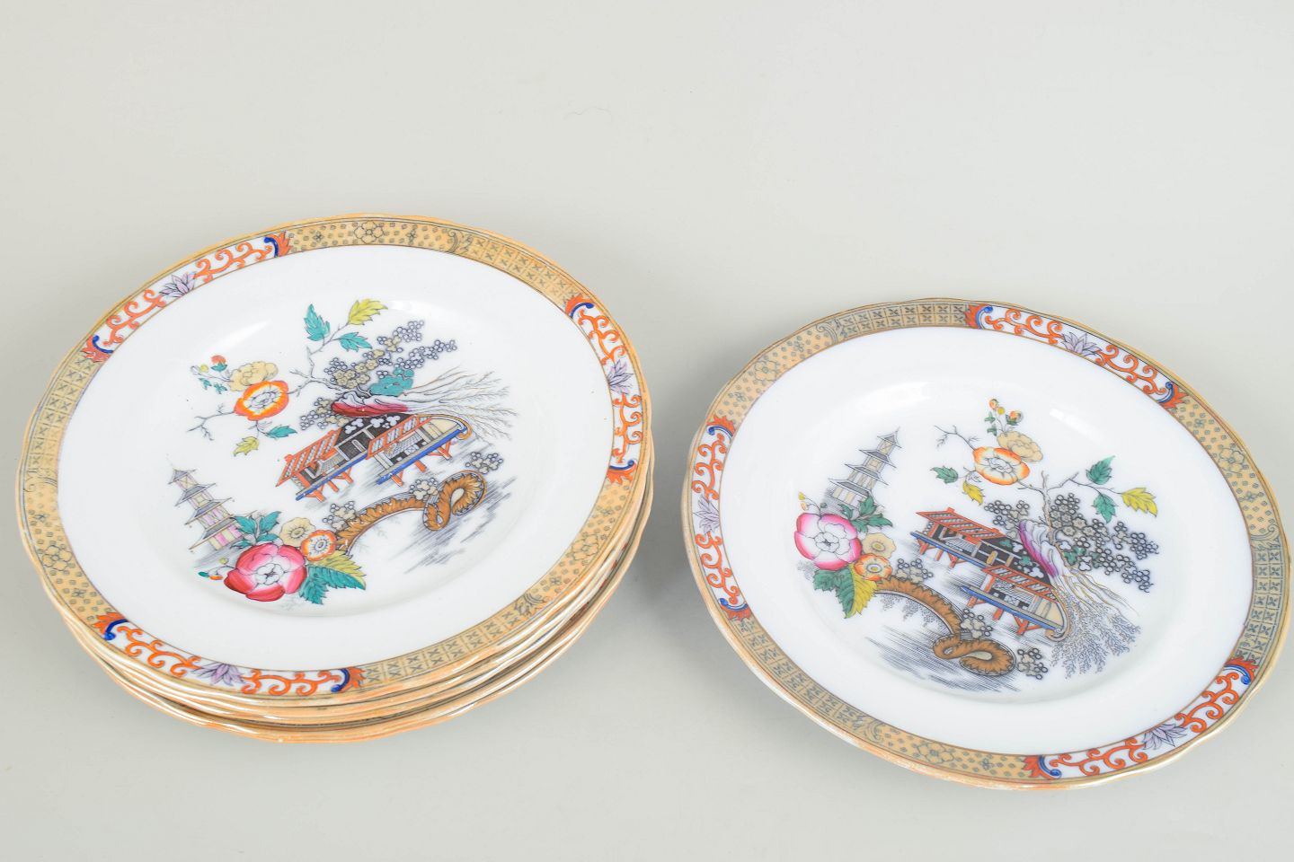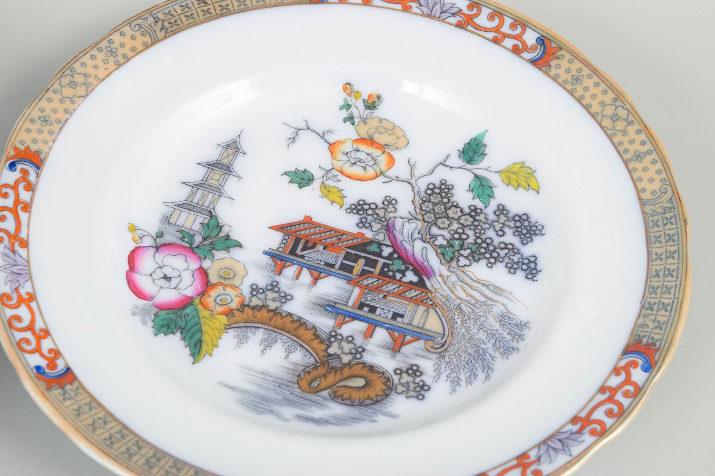 Middagstallerkener i fajance med orientalsk inspireret dekoration i polykrome farver og detaljerig bemaling i japansk stil, karakteristisk for Rörstrands japanismeproduktion fra begyndelsen af 1900-tallet.