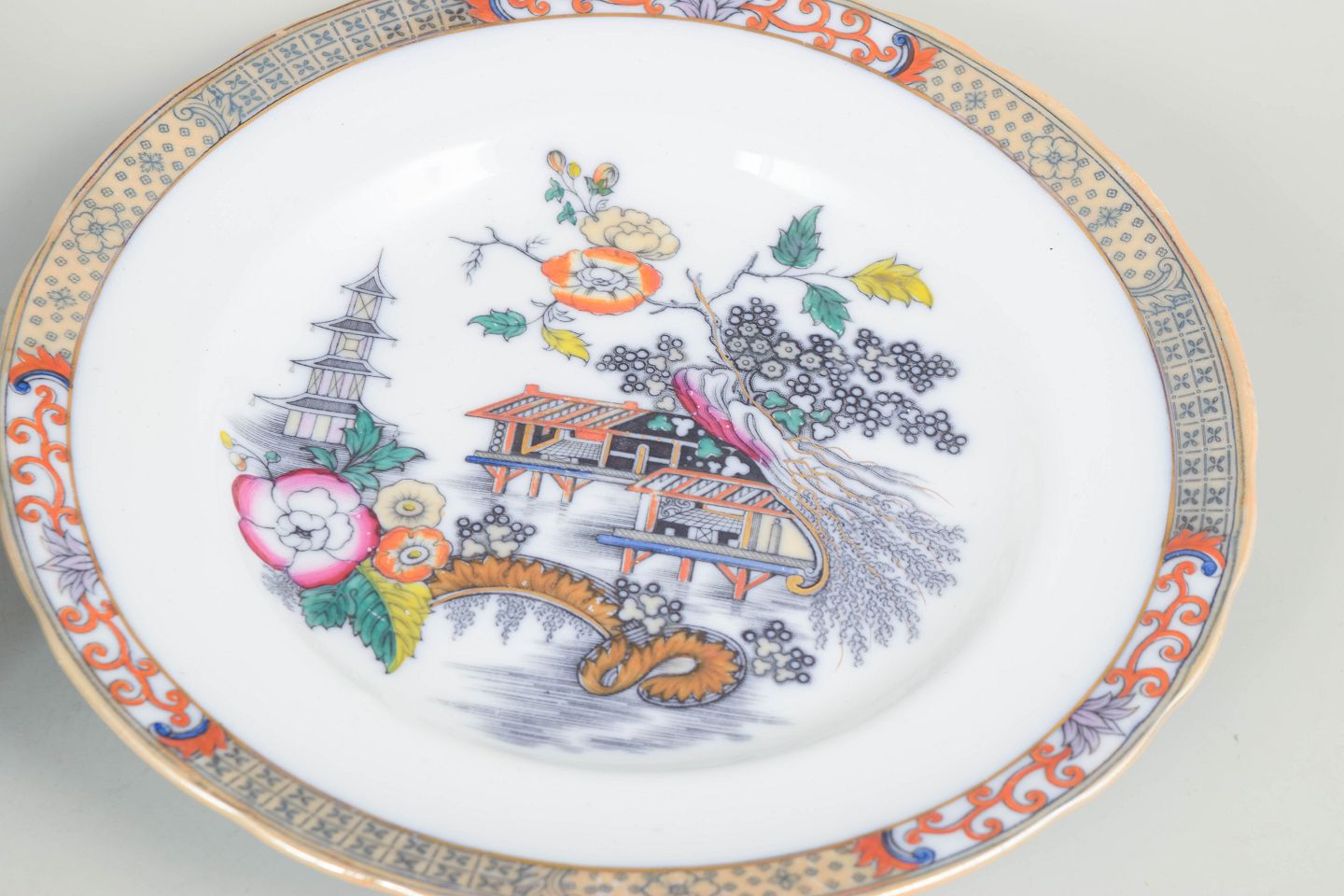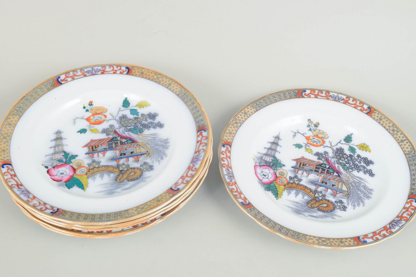 Middagstallerkener i fajance med orientalsk inspireret dekoration i polykrome farver og detaljerig bemaling i japansk stil, karakteristisk for Rörstrands japanismeproduktion fra begyndelsen af 1900-tallet.