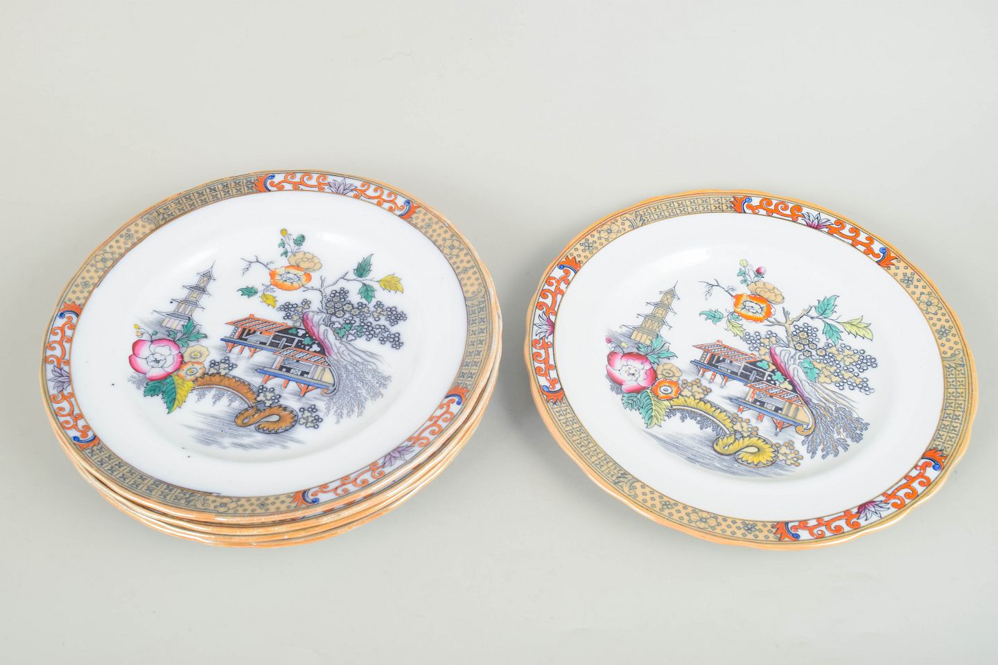 Dinner plates in faience with oriental-inspired decoration in polychrome colours and finely detailed painting in Japanese style, characteristic of Rörstrand’s japonisme production from the early 20th century.