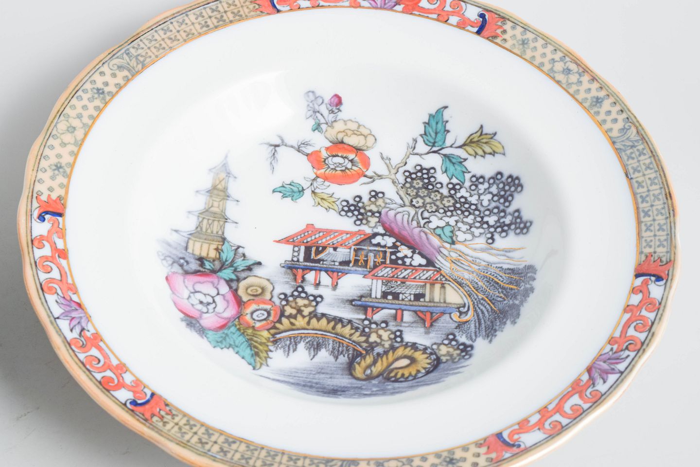 Deep plates in faience with oriental-inspired decoration in polychrome colours and finely detailed painting in Japanese style, characteristic of Rörstrand’s japonisme production from the early 20th century.
