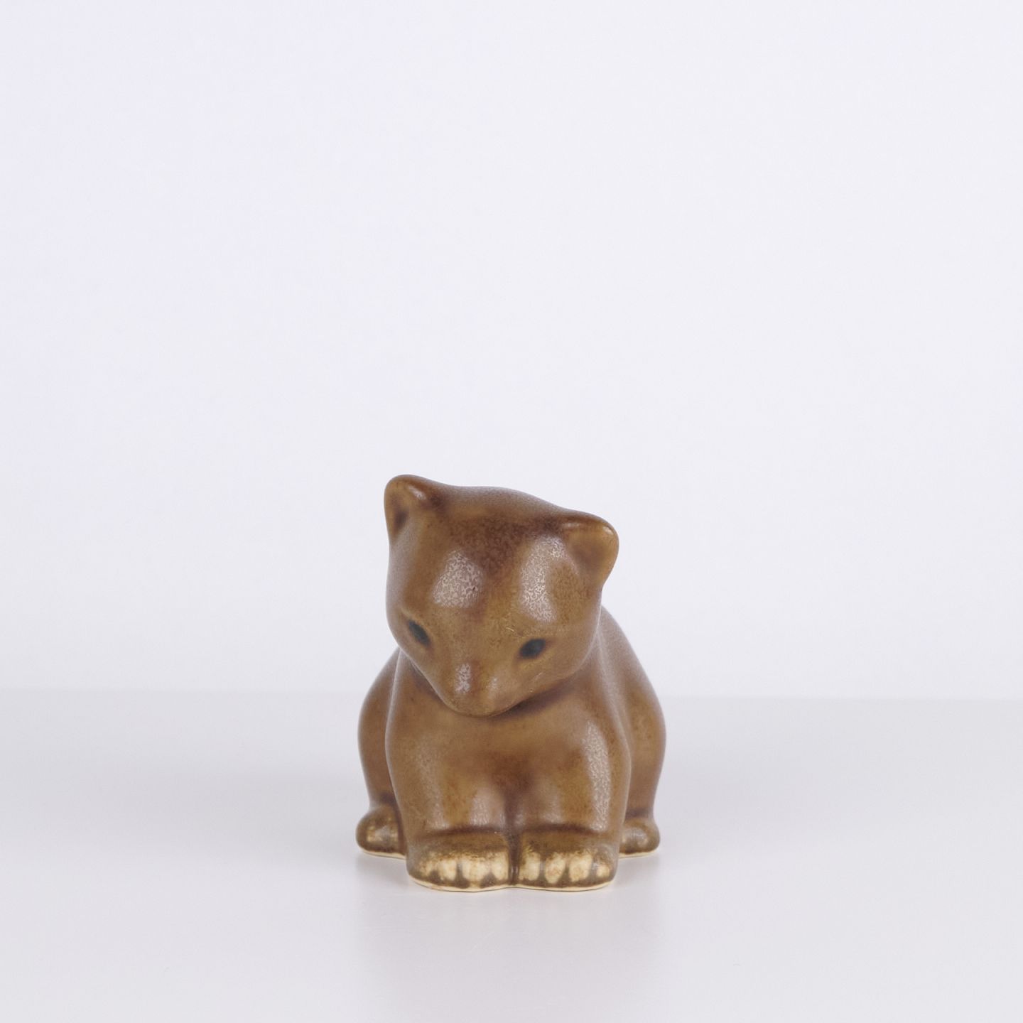 Kattefigur af Knud Basse udført i glaseret keramik. Figuren har bløde organiske former og et roligt stiliseret udtryk, kendetegnende for Knud Basses populære dyrefigurer. Dansk kunstkeramik og eftertragtet samlerobjekt fra midcentury perioden.