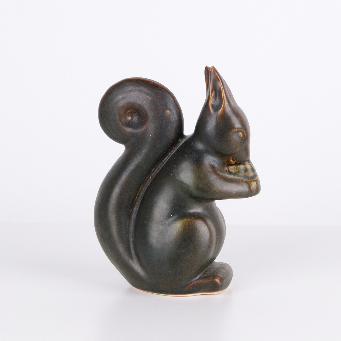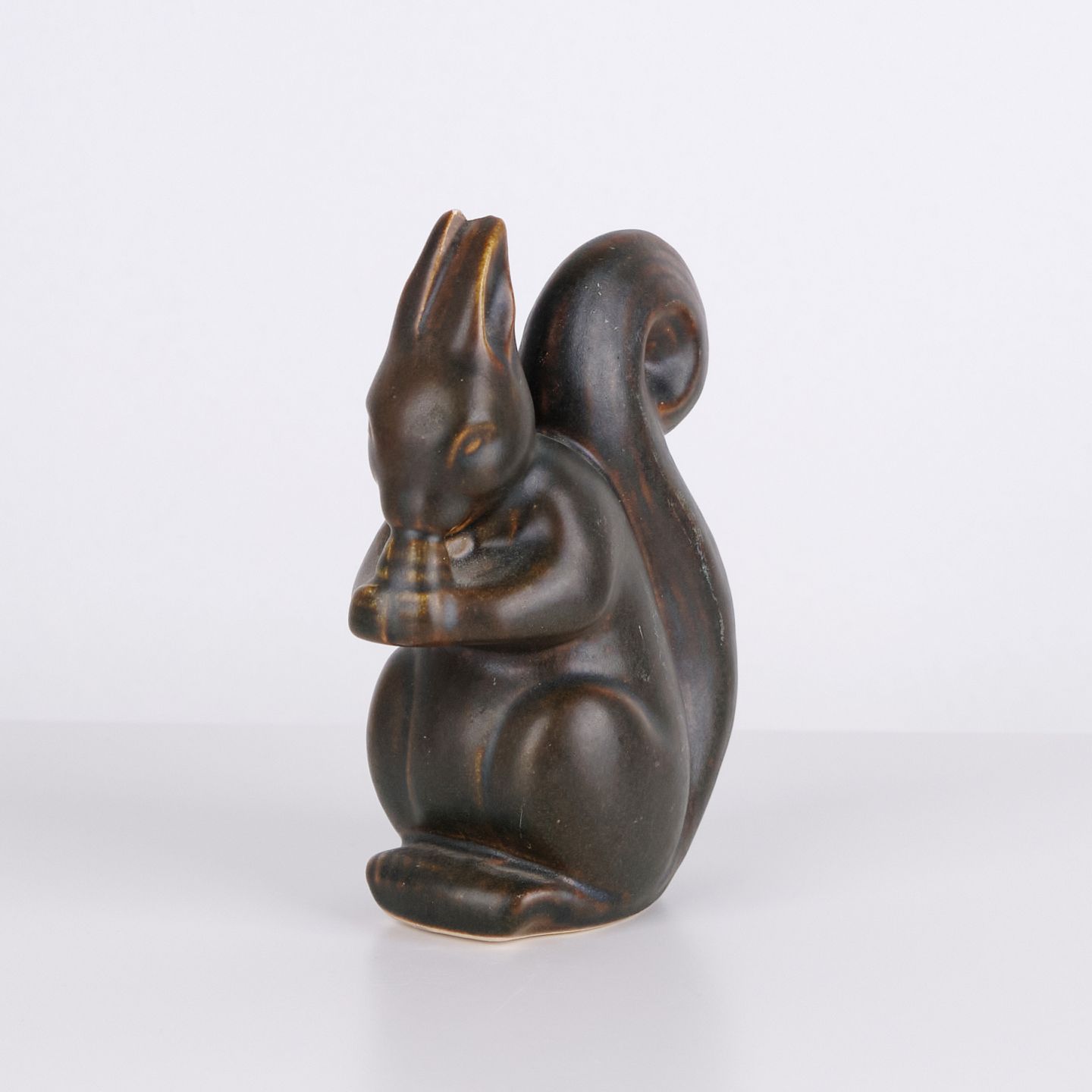 Keramisk egernfigur af Knud Basse udført i mørk glasur med varme brune nuancer. Figuren viser et siddende egern med nød og fremstår med markante organiske linjer, som kendetegner dansk studiokeramik fra perioden. Knud Basse figurer er kendte samlerobjekter inden for dansk dyrekeramik.