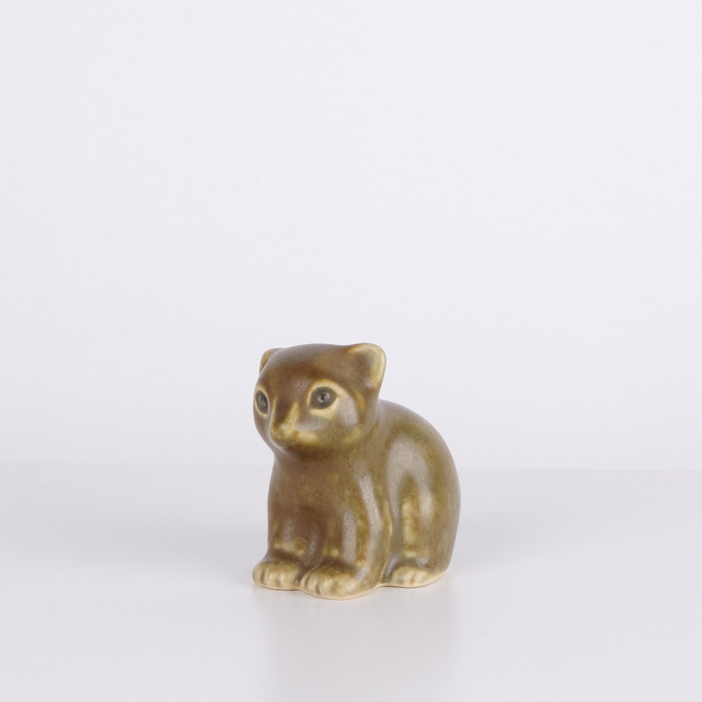 Kattefigur af Knud Basse udført i brun glaseret keramik. Modellen viser siddende kat med fremhævede øjne og afrundet kropsform.