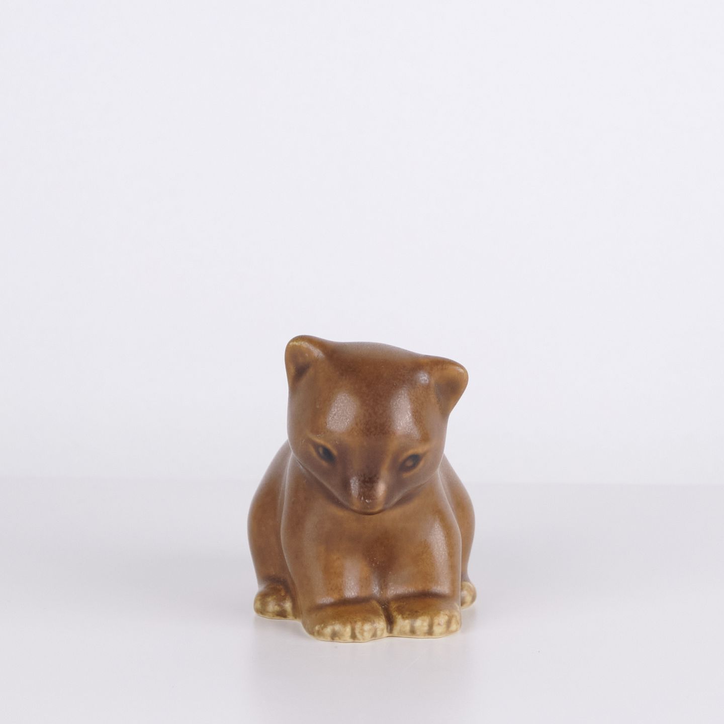 Bjørnefigur af Knud Basse udført i lys brun glaseret keramik. Figuren viser siddende bjørn med sænket hoved, markerede poter og bløde organiske former. En klassisk mindre model fra Knud Basses serie af dyrefigurer fremstillet i Danmark i 1960’erne.