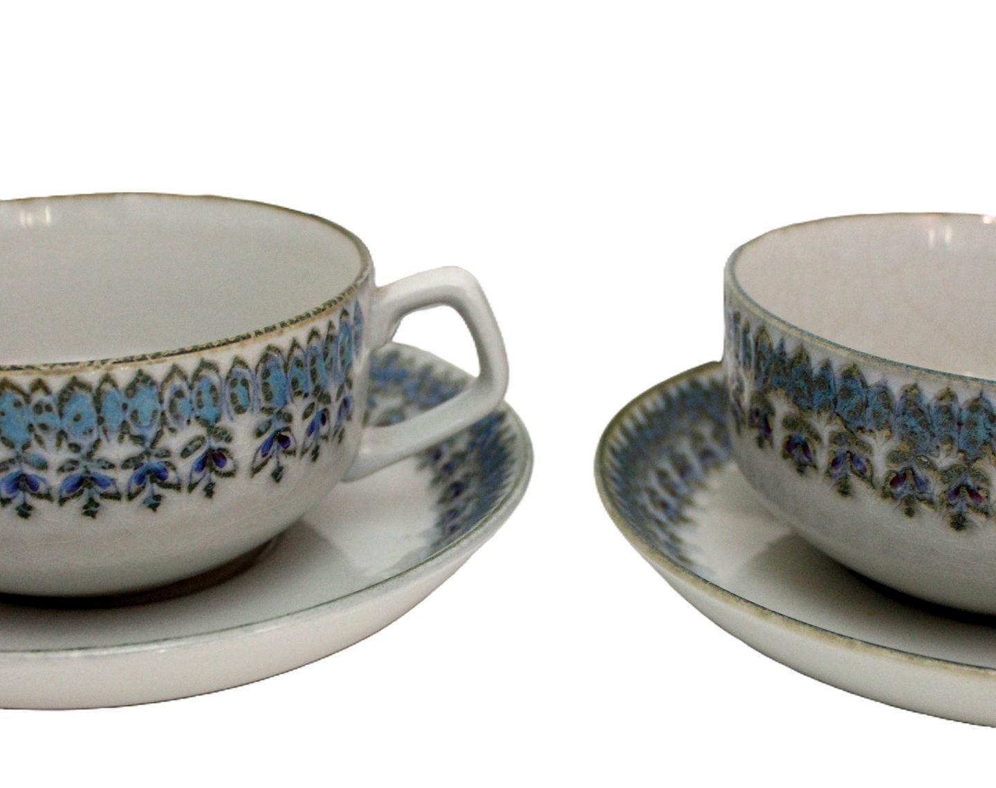 Aluminia, Berte, Tekop med underkop. Designet af Berte Jessen. Produceret i perioden 1962-66. OBS: Krakeleringer på alle dele, kop, underkop og kagetallerken. Ingen skår.