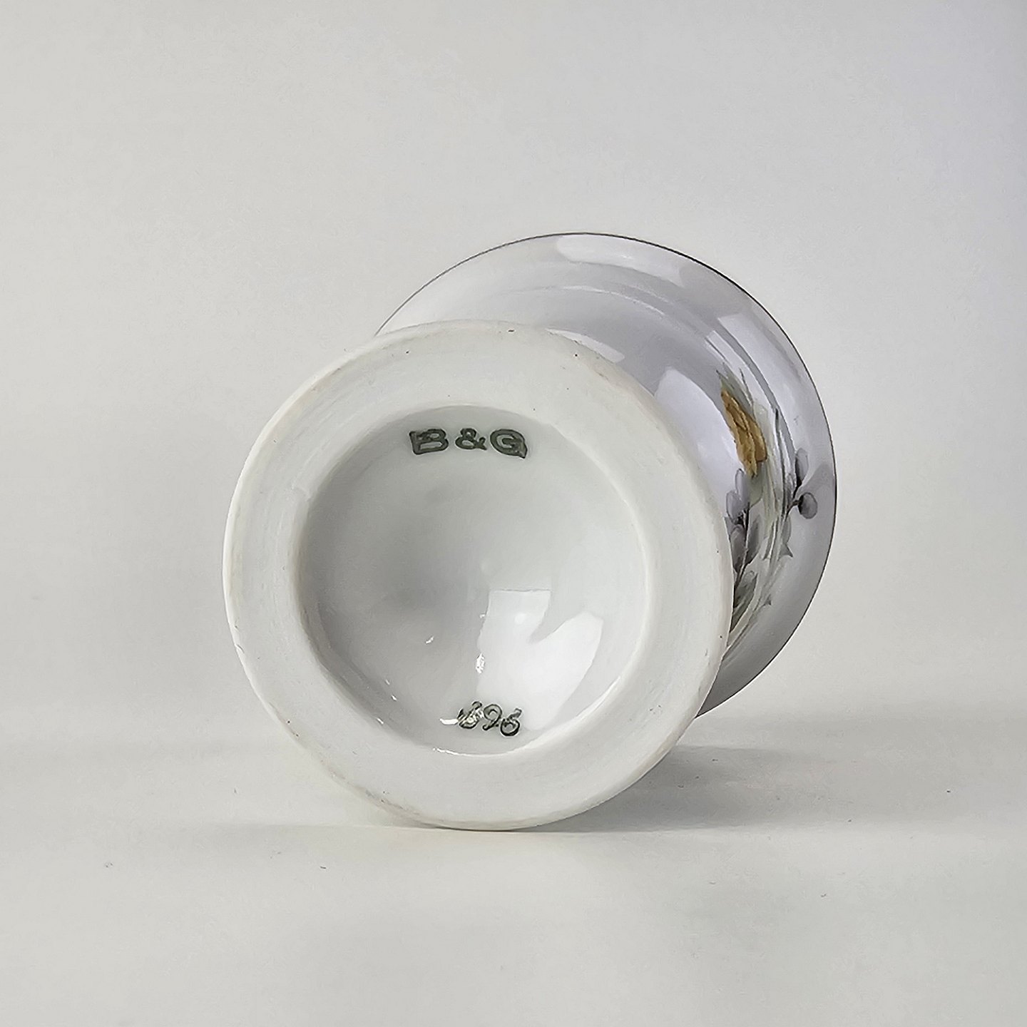 Bæger i hvidt porcelæn med guldkant og motiv af påskelilje