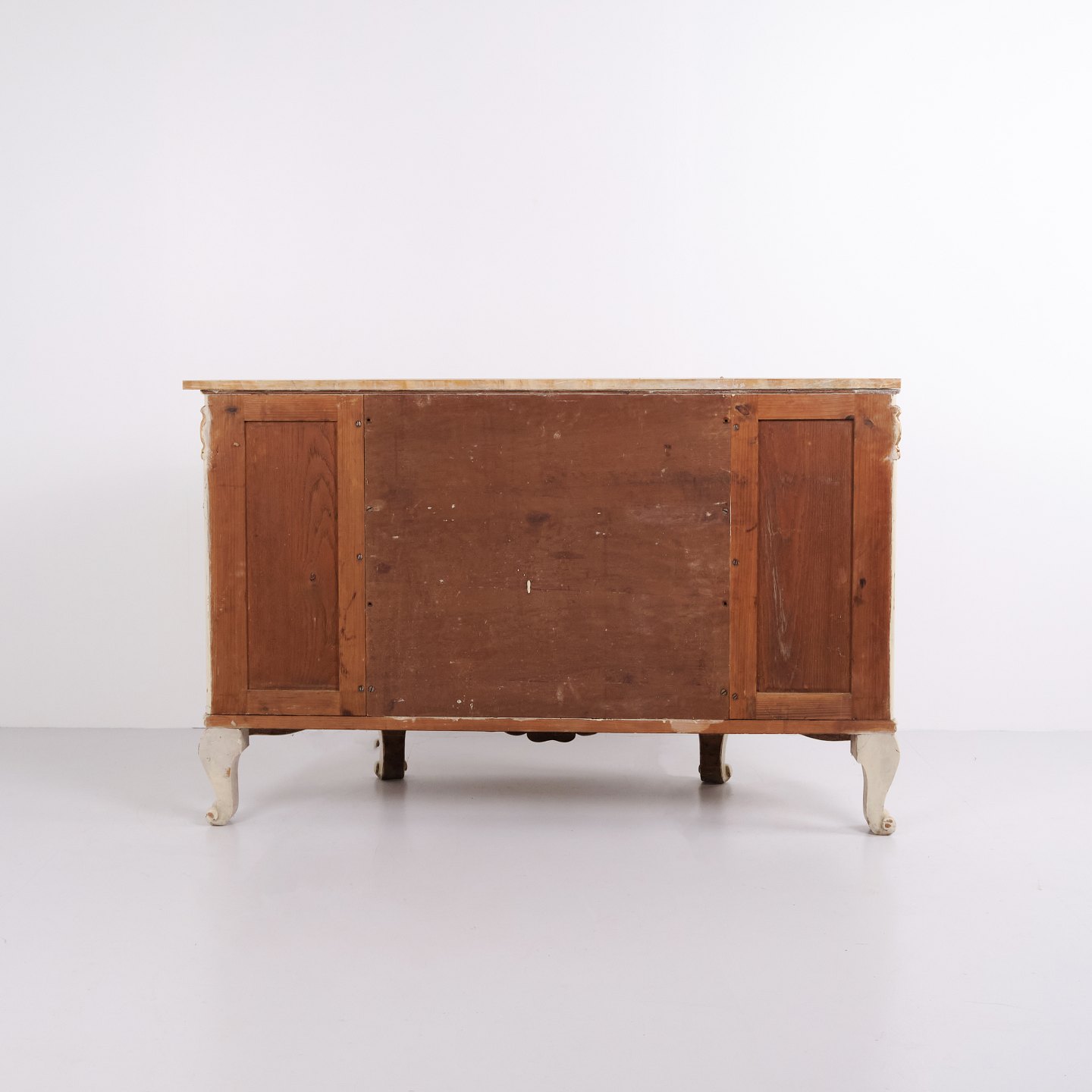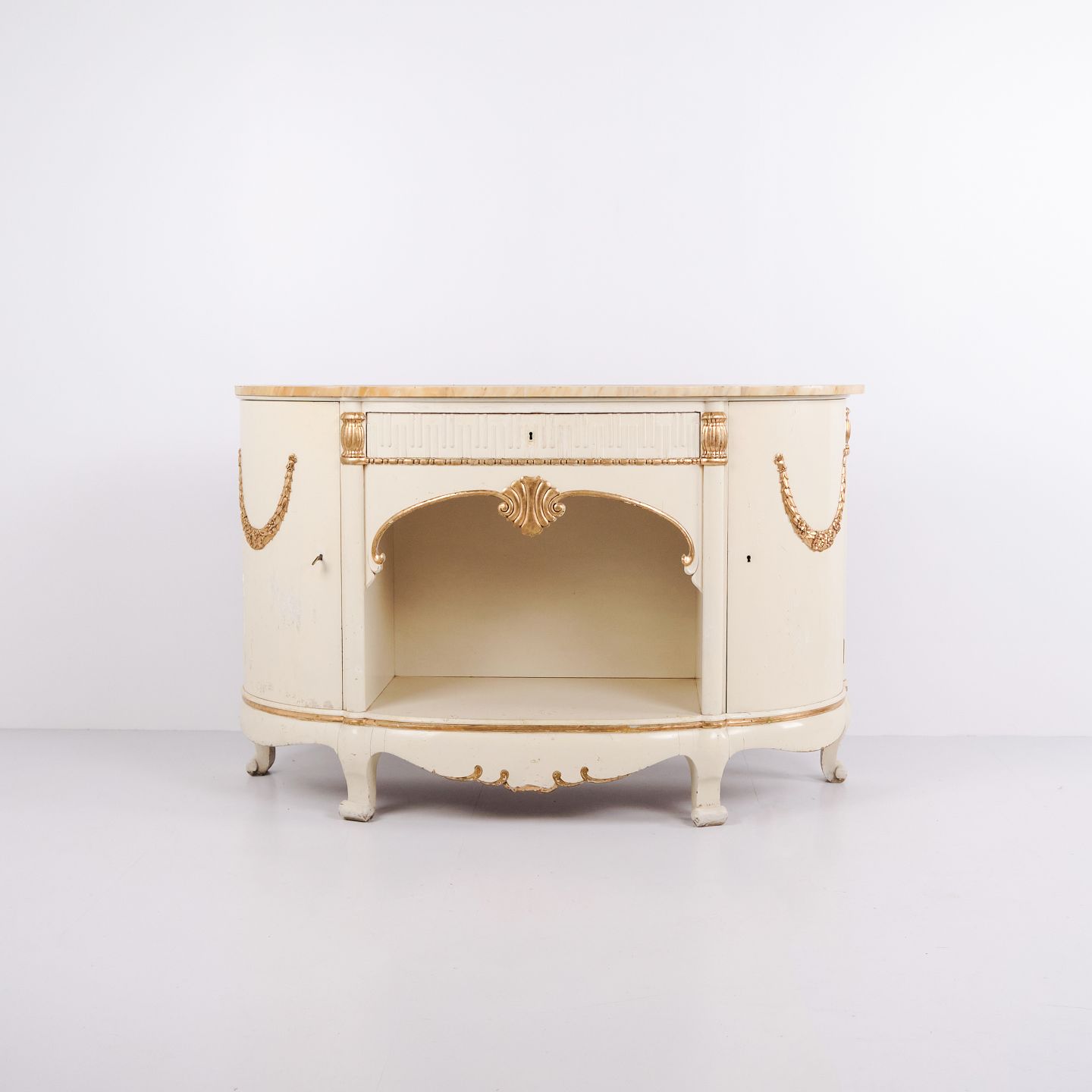 Buet skænk fremstillet af P. Svensen, N. Frihavnegade 15, København. Møblet er udført i malet træ med profilerede detaljer, forgyldte dekorationer og original marmorplade. Fronten har åben midterniche, lille skuffe samt to buede skabe med indvendige hylder. Klassisk empireinspireret form med buede sider, svungne ben og dekorative beslag. Velegnet som entrémøbel, konsol eller opbevaringsskænk.
