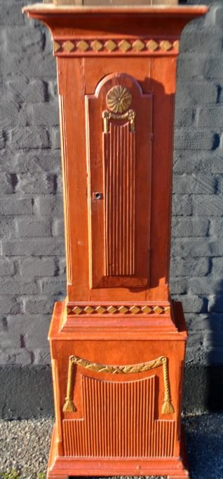 Antikt dansk standur i malet kasse, 1807. Udført af urmager Søren Marcussen (ca. 1775 - ?), Sønderlund, Måbjerg. Salling. Rødlig malet masse med forguldninger og udskæringer. Urværk med tinskive. H.: 200 cm. B.: 43 cm. D.: 26 cm.