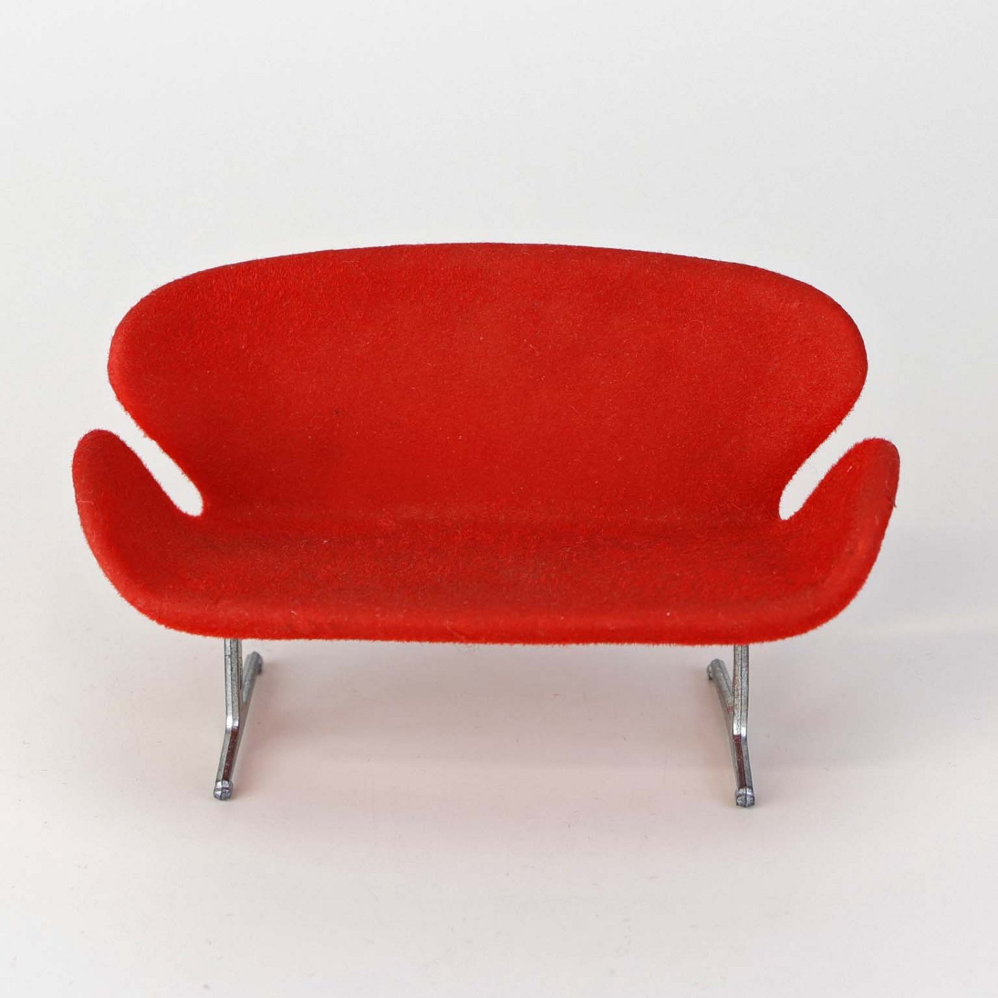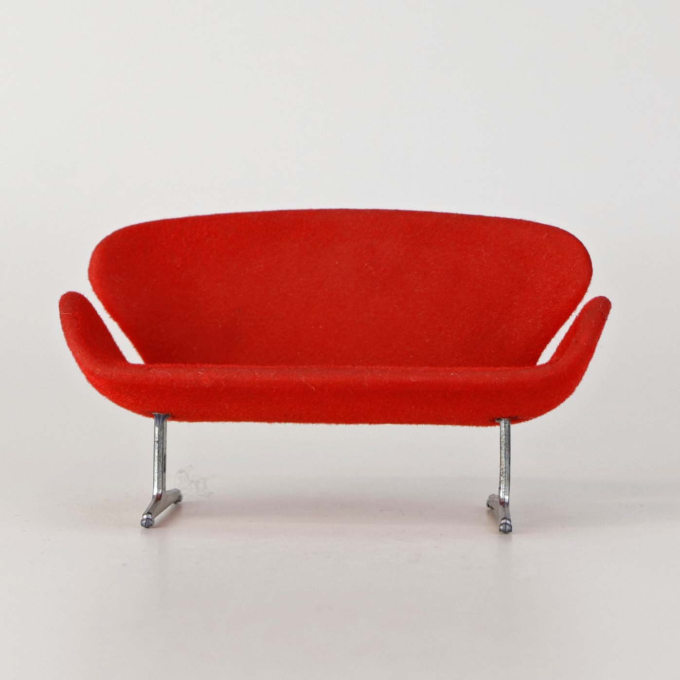 Miniature designermøbel til dukkehus med model af Arne Jacobsen's Svanesofa i rød farve med stel i metal.