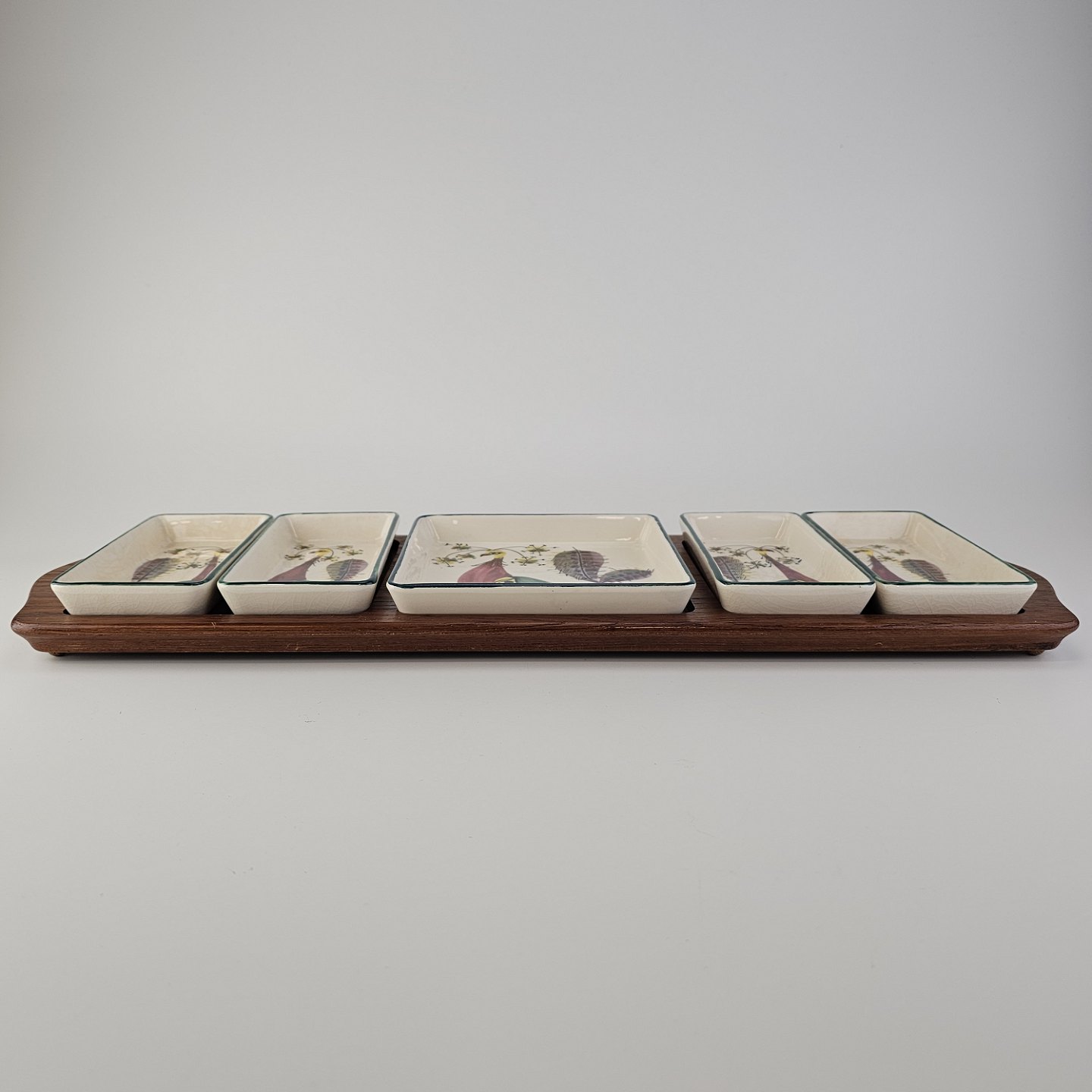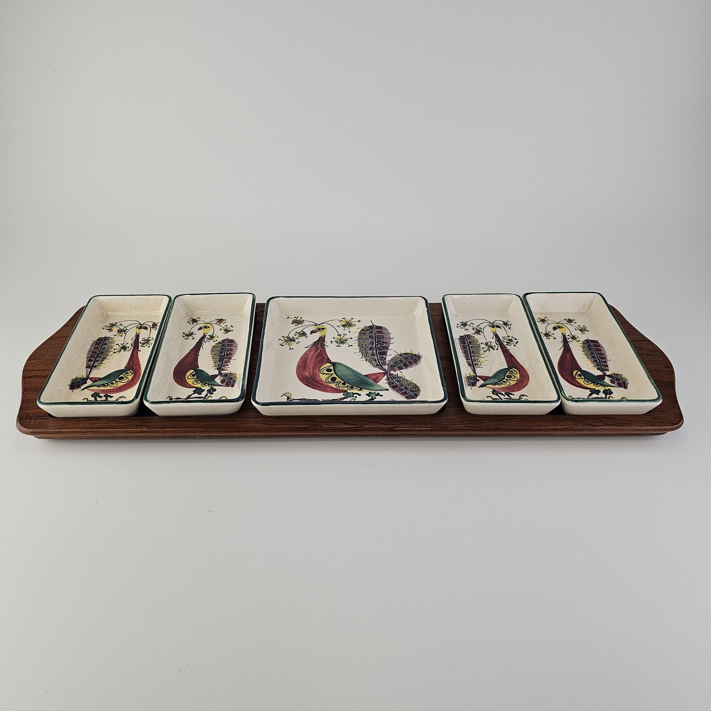 Cabaret fad fra serien Tenera med bakke i teak træ og fem små, firkantede fade i fajance med dekoration af påfugle