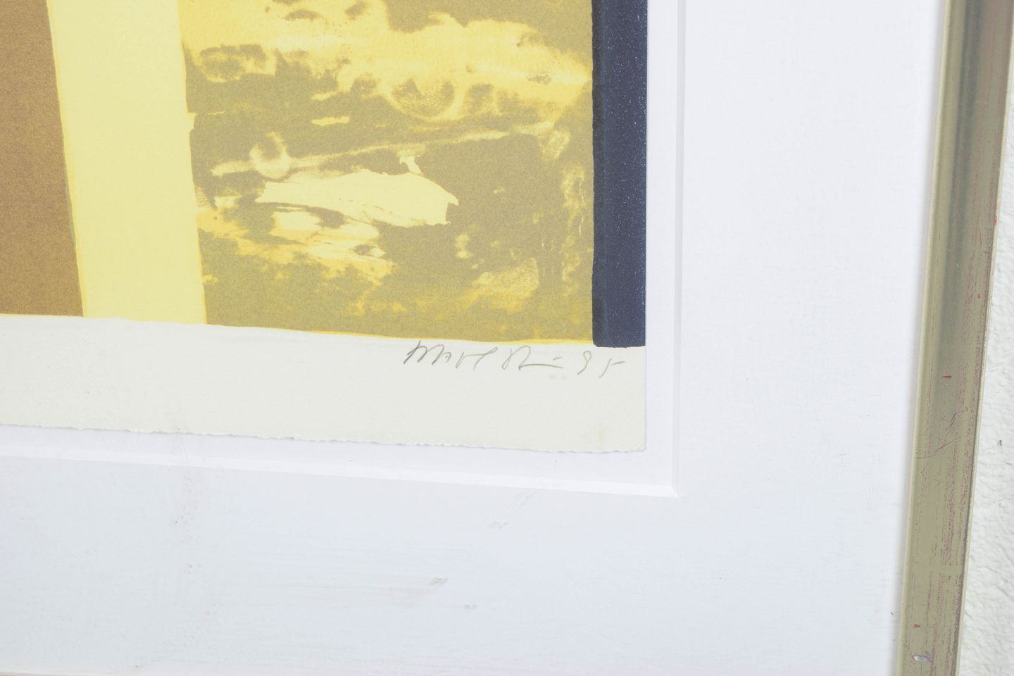 Abstrakt og grafisk komposition med organiske former og geometriske felter i afdæmpede farver, udført som farvelitografi, signeret og nummereret 30/150, dateret 1995.