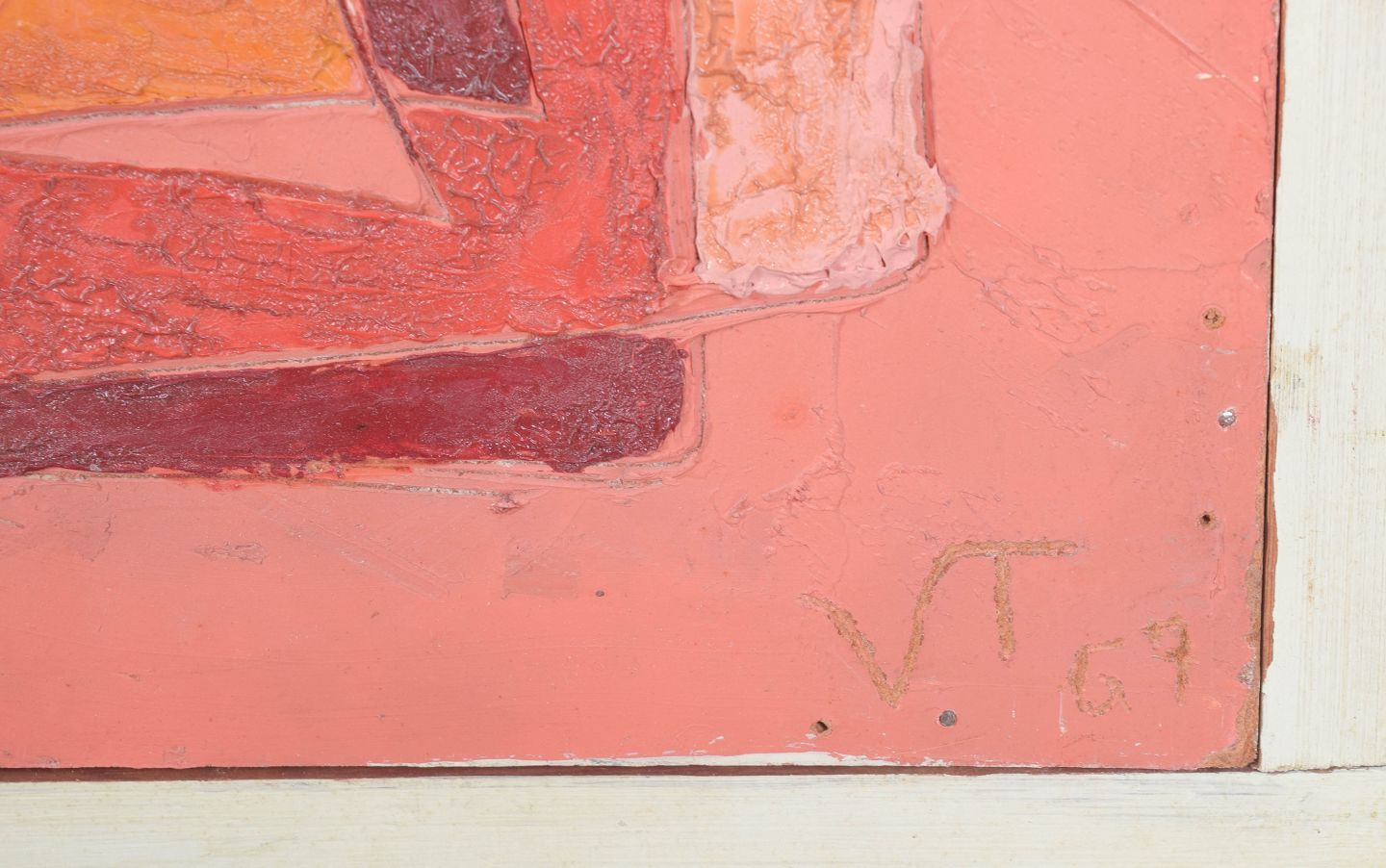 Abstrakt ekspressiv komposition opbygget i et mosaiklignende formsprog med varme røde og rosa nuancer, hvor flader og rytmiske opdelinger danner et dynamisk og dekorativt helhedsindtryk. Signeret VT.