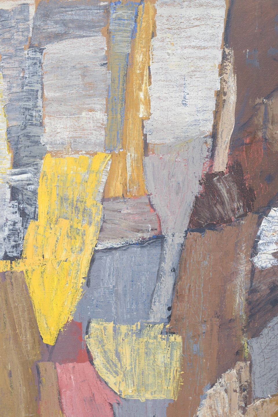 Abstrakt komposition med kraftfuld pensel- og paletknivsføring i jordfarver og gule nuancer. Titel : “från Hven – Backafallen”, signeret og dateret 1961.