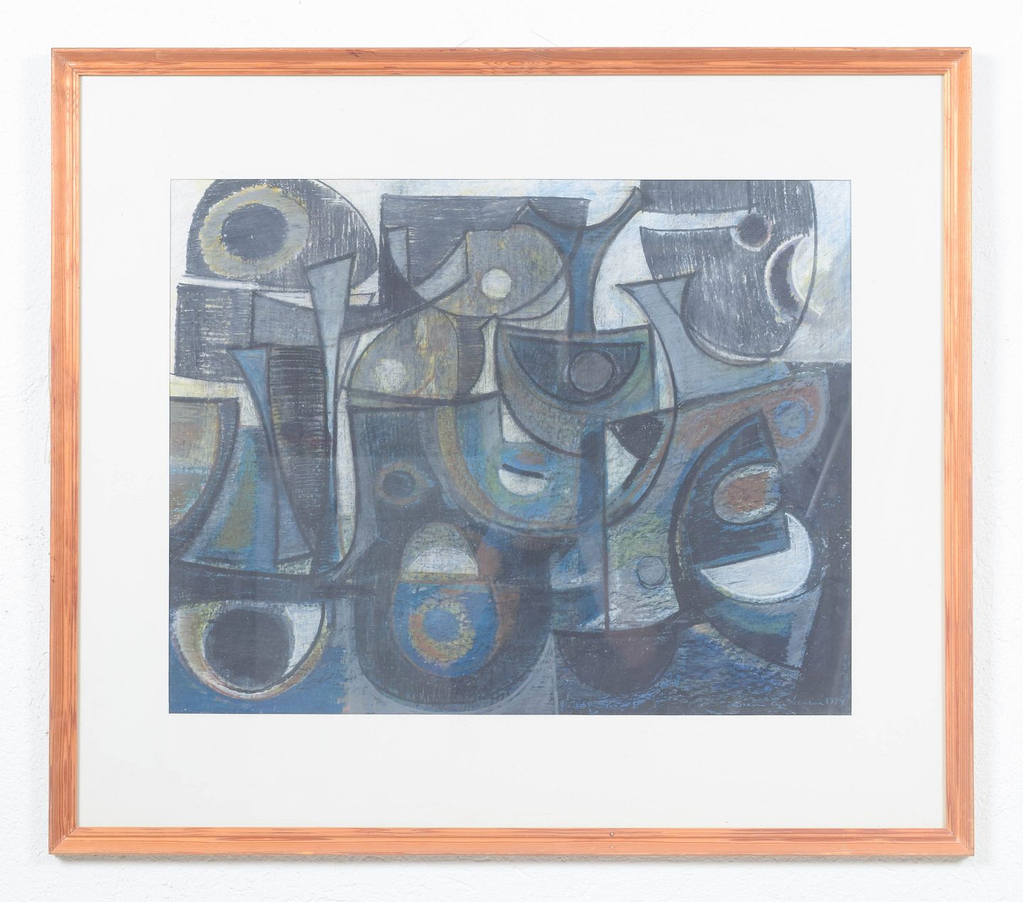 Nonfigurativ abstrakt komposition i blå og grå nuancer med organiske og geometriske former, udført i farvekridt på papir, monteret bag glas. Signeret og dateret 1984.