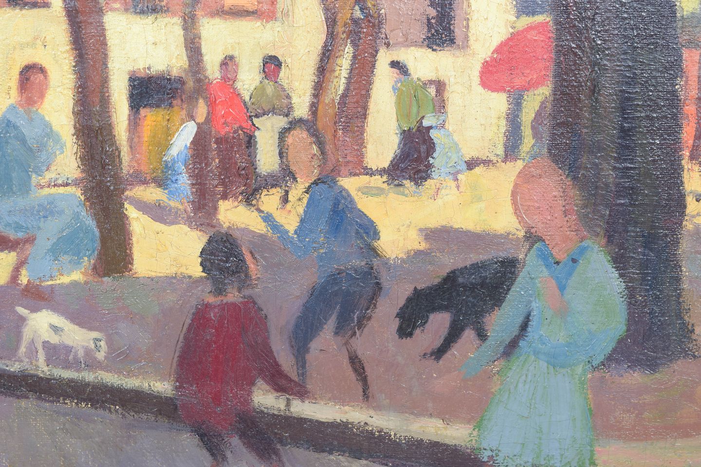Motiv fra Place du Tertre i Montmartre med figurer, bygninger og træer gengivet i en tidlig modernistisk stil med flade farvefelter og dekorativ komposition. Maleriet er signeret og fremstår med en klar og farverig billedopbygning karakteristisk for kunstnerens arbejde fra 1930’erne–1940’erne.