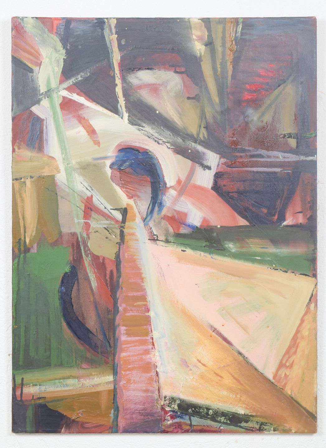 Ekspressiv modernistisk komposition med dynamiske penselstrøg og geometrisk-opløste former i en levende farvepalet. Motivets struktur antyder arkitektoniske elementer og rumlige spændinger, udført med en fri og gestisk tilgang. Olie på lærred, usigneret.