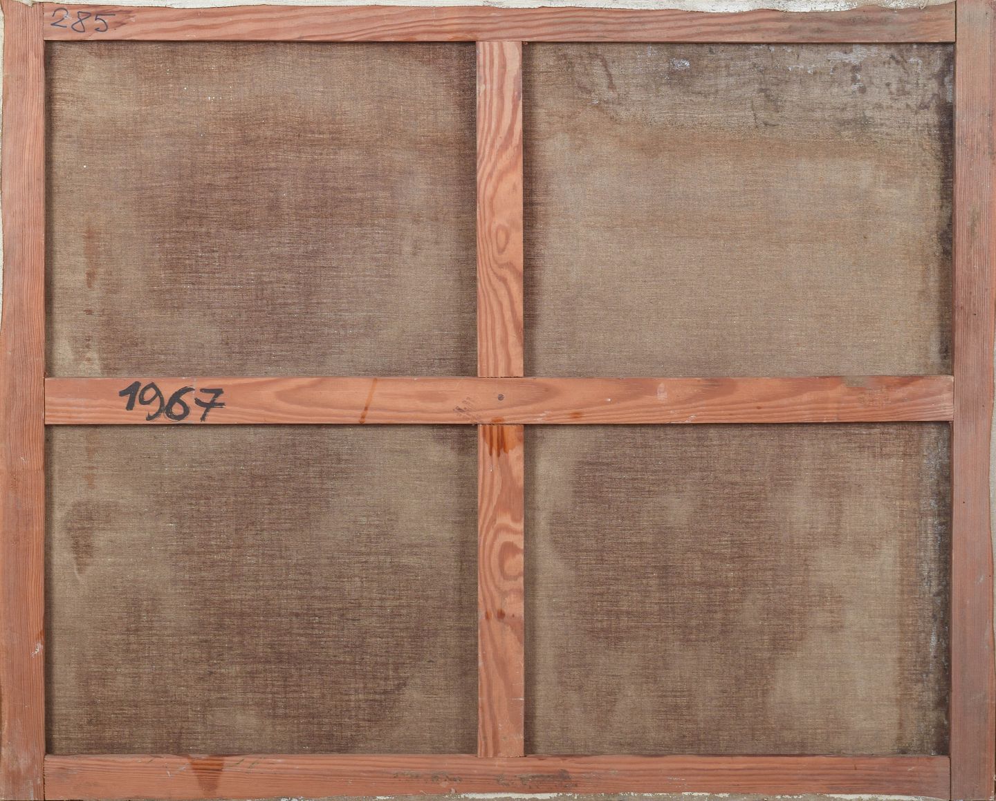 Abstrakt komposition udført i en ekspressiv modernistisk stil med lagdelte penselstrøg og komplekse lineære strukturer i dæmpede blå, grå og jordfarvede nuancer. Kompositionen fremstår dynamisk med en næsten figurativ rytme i det abstrakte formsprog. Olie på lærred, signeret og dateret 1967.