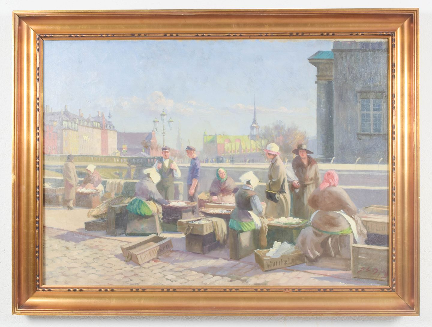 Stemningsfuld skildring af livet ved Gammel Strand i København med fiskesælgende koner og byens daglige liv, udført i et naturalistisk og lysfyldt maleri. Signeret.