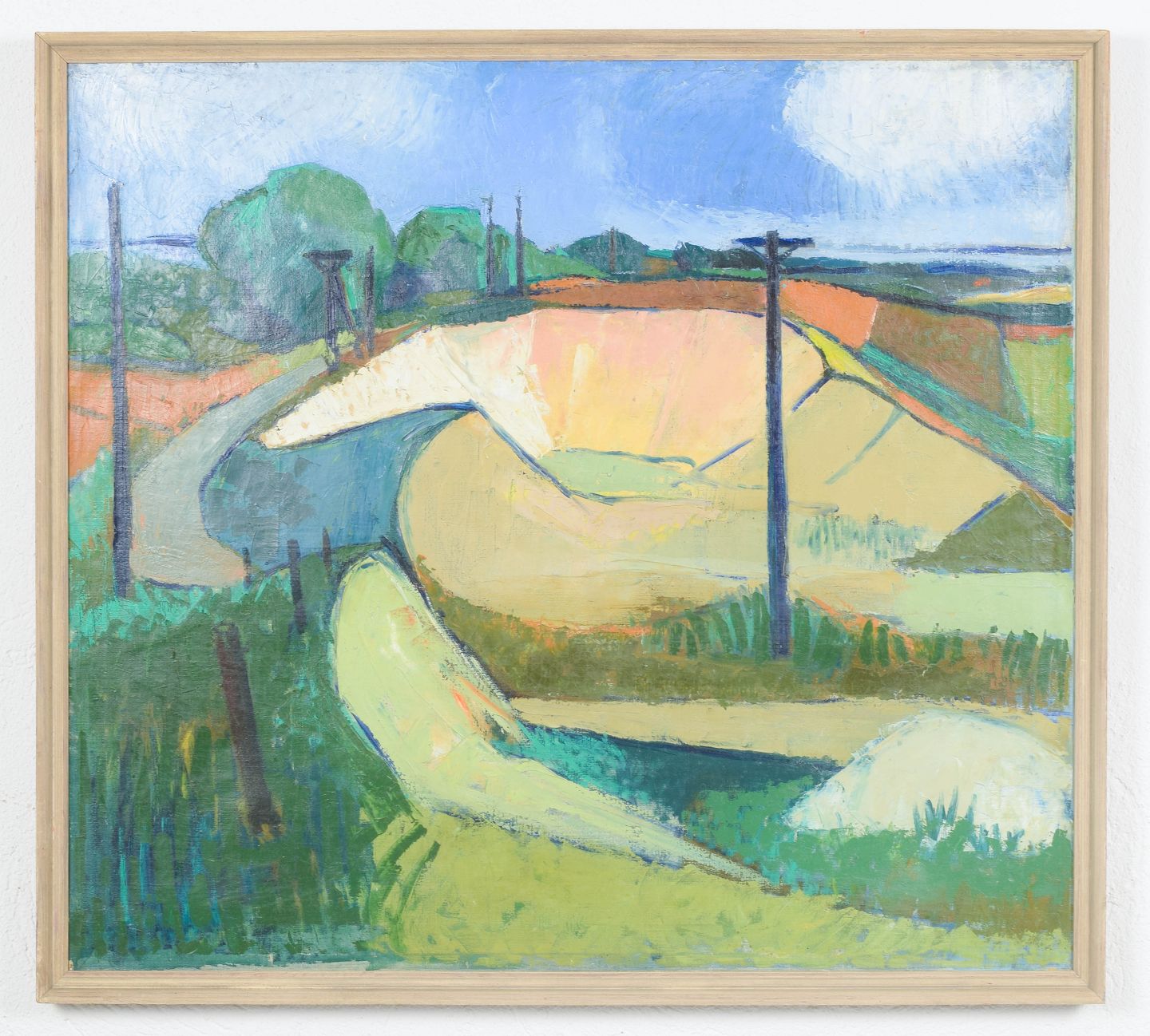 Farverigt landskabsmotiv udført i en tidlig modernistisk stil med bløde, organiske former og forenklede flader. Kompositionen er præget af en lyrisk tilgang til naturen med marker, bakker og telegrafpæle gengivet i en dekorativ og næsten abstraheret form. Udført i olie på lærred, usigneret.