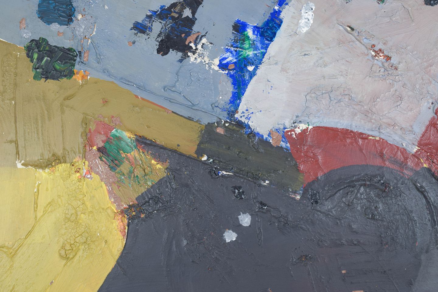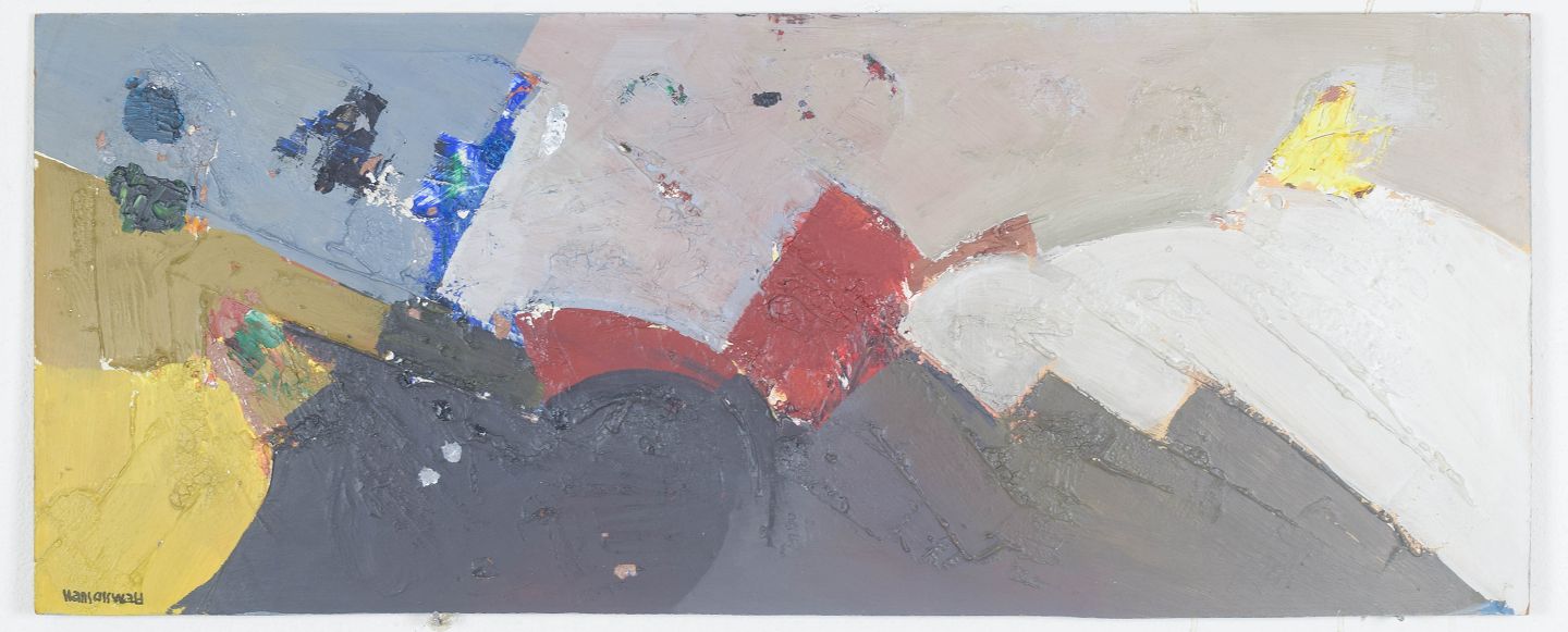Abstrakt komposition udført i olie på plade med brede, organiske farvefelter og en afdæmpet, jordnær farvepalette. Kompositionen fremstår med en balanceret opbygning mellem mørke og lyse partier, typisk for midten af det 20. århundredes nordiske modernisme.