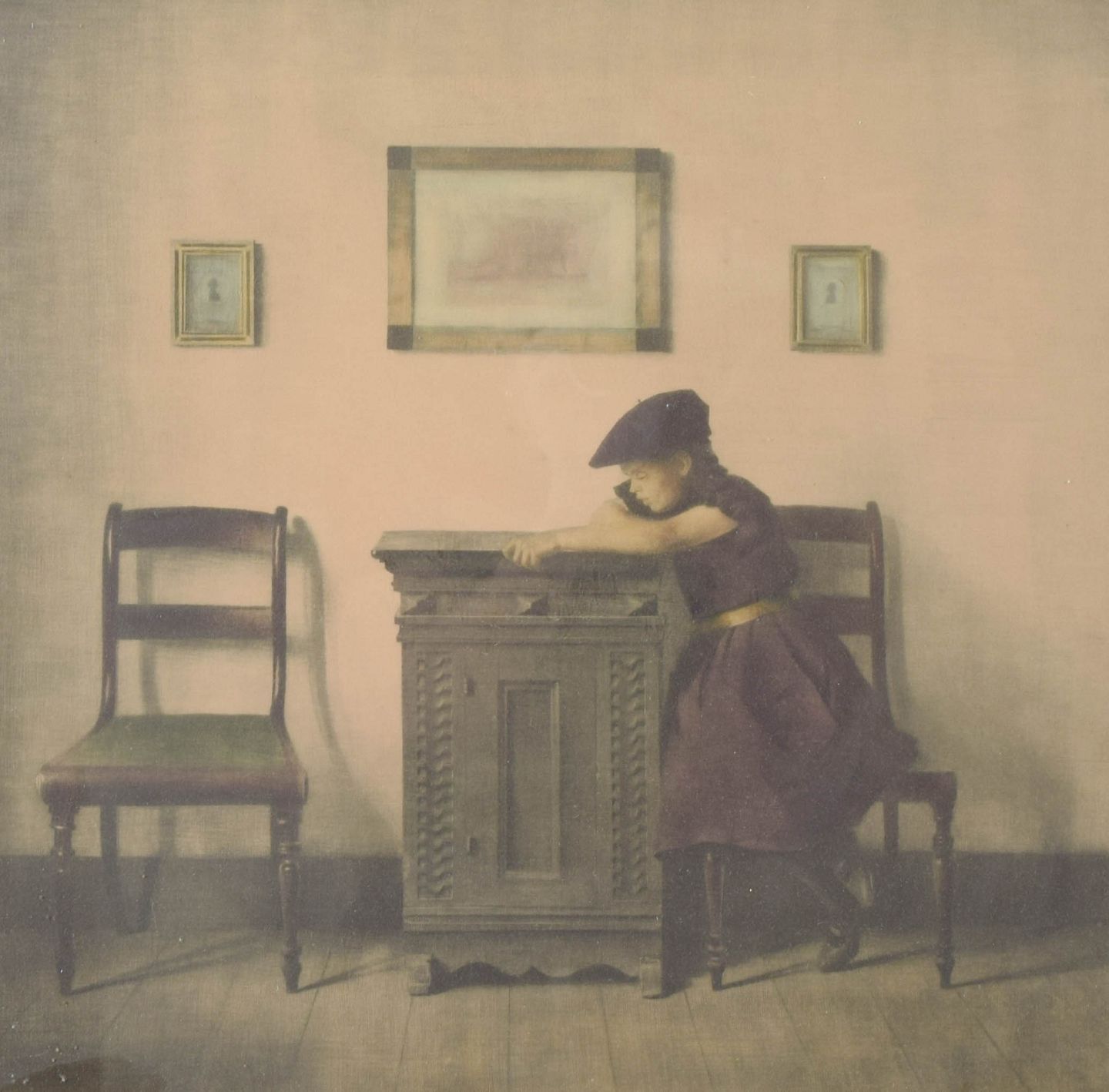 Stilfærdigt interiørmotiv med en ung pige ved et lille møbel, udført som original radering på papir. Kompositionen er præget af ro, afdæmpede farver og en intim stemning, karakteristisk for Ilsteds arbejde med lys, rum og hverdagsmotiver i hjemlige omgivelser.