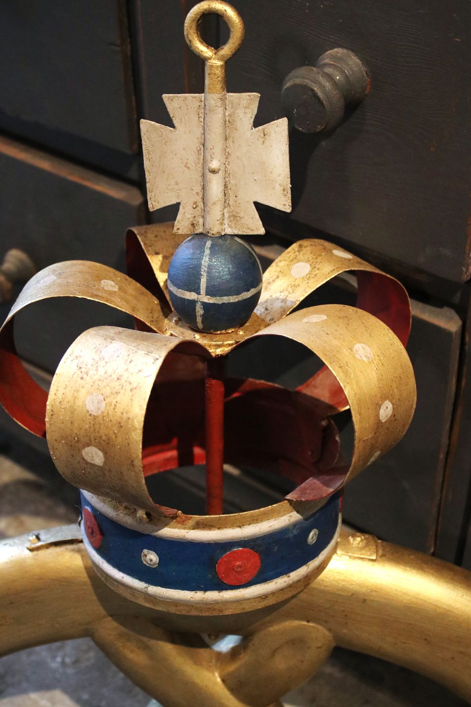 Old baker's sign shaped like a pretzel, gilded with a metal crown...