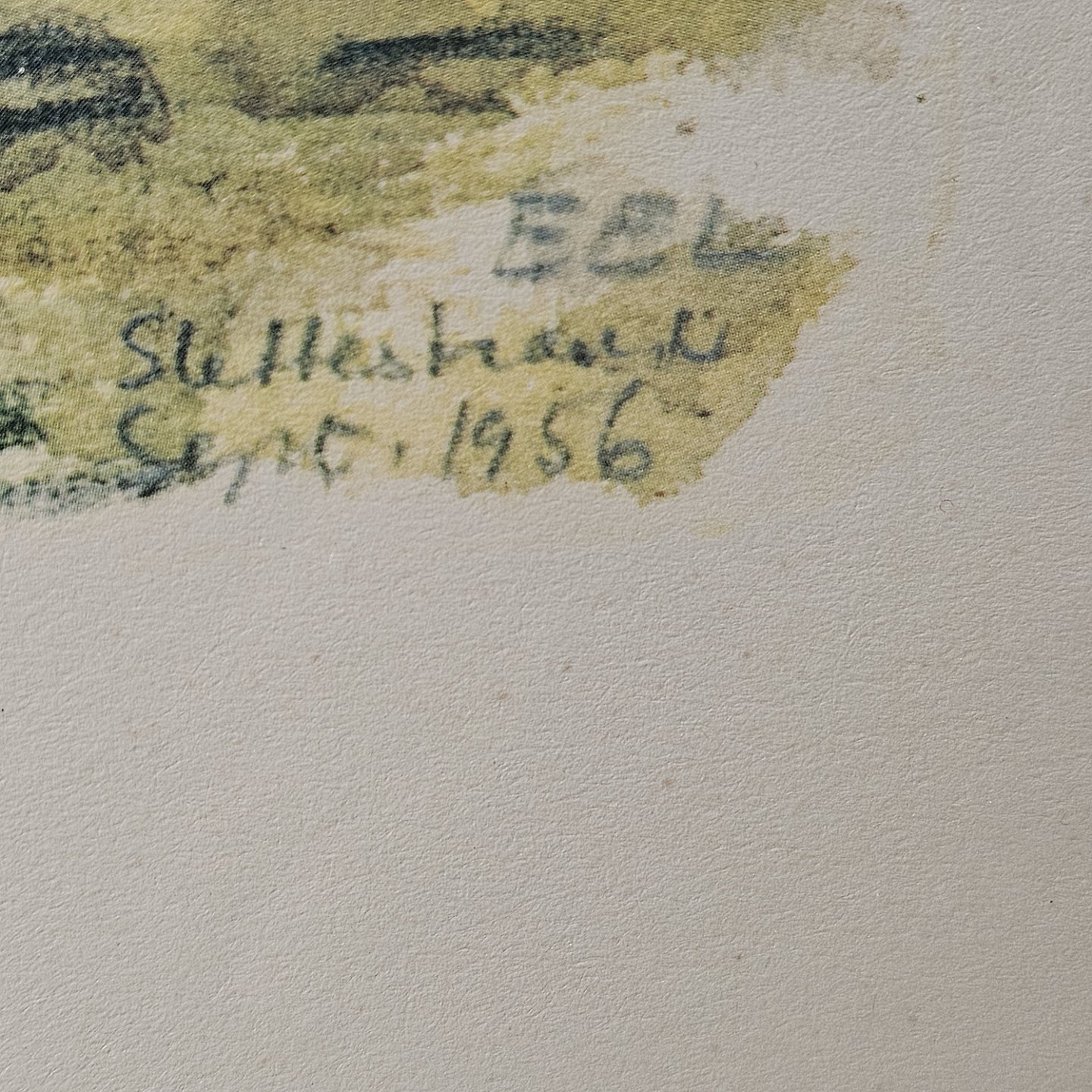 Akvarel maleri på papir med motiv af Slettestrand. Monteret i sortmalet træramme, dateret 1956