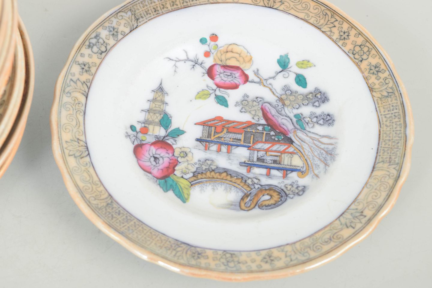 Decorative small faience plates with polychrome decoration in an orientalist Japanese style featuring pagoda motifs, buildings, bird and floral elements. Model Japan, produced between 1866–1925 and dated to the 1880s.