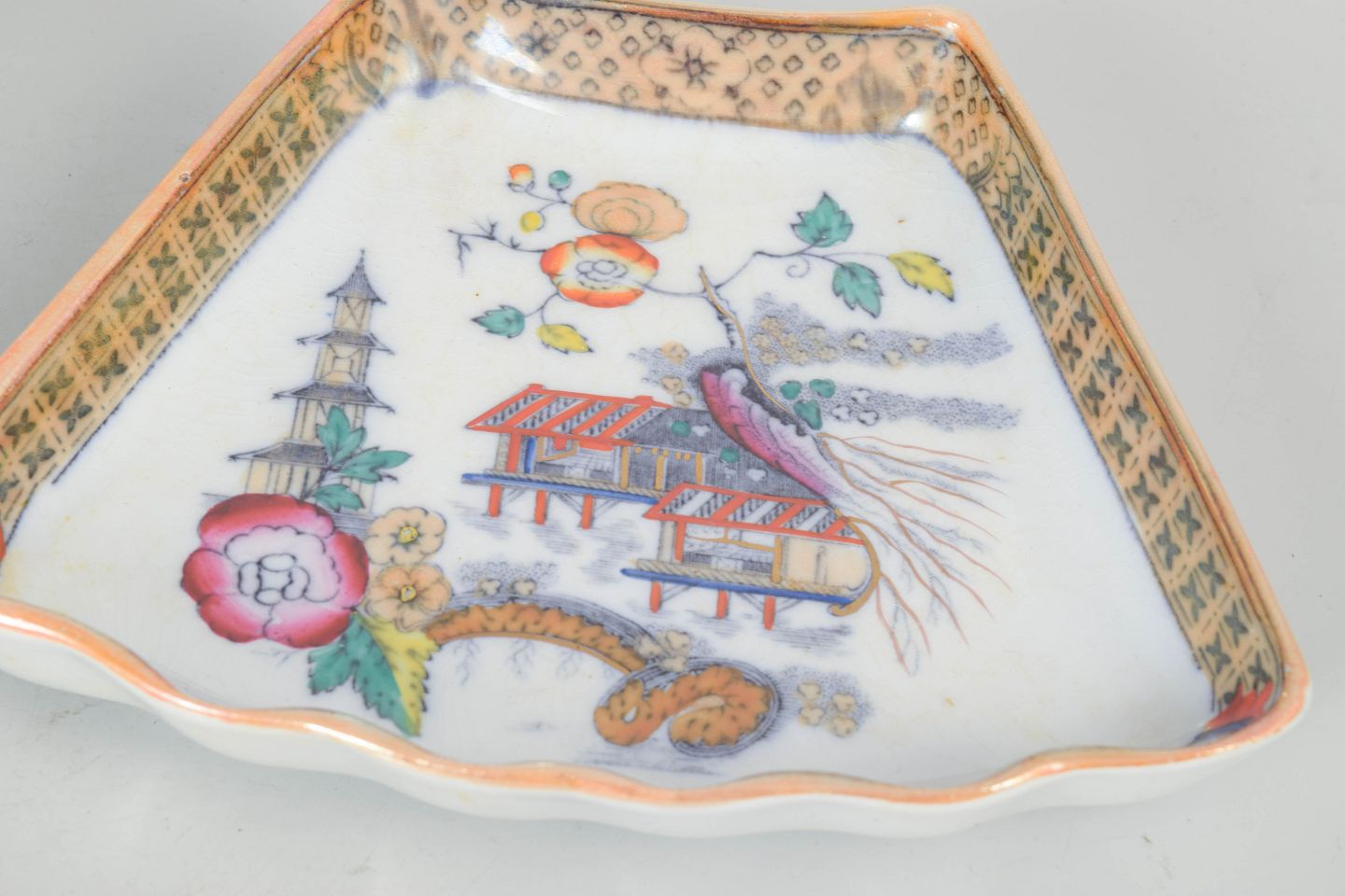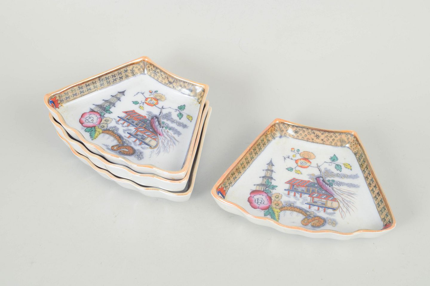 Dekorative firkantede fade i fajance med polykrom dekoration i orientalistisk japansk stil med pagodemotiv, fugl og blomster. Model Japan, produceret i perioden 1866–1925 og dateret til 1880’erne.