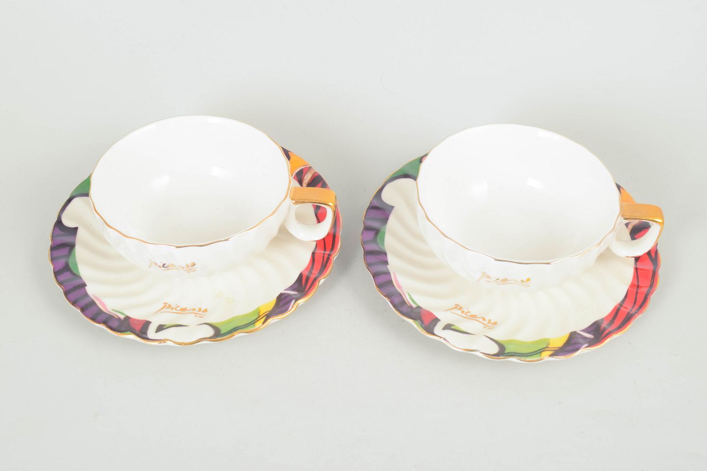 Two large teacups with matching saucers, marked Picasso. The cups have an elegant shape with gilt rims and multicoloured decoration along the border of the saucers.