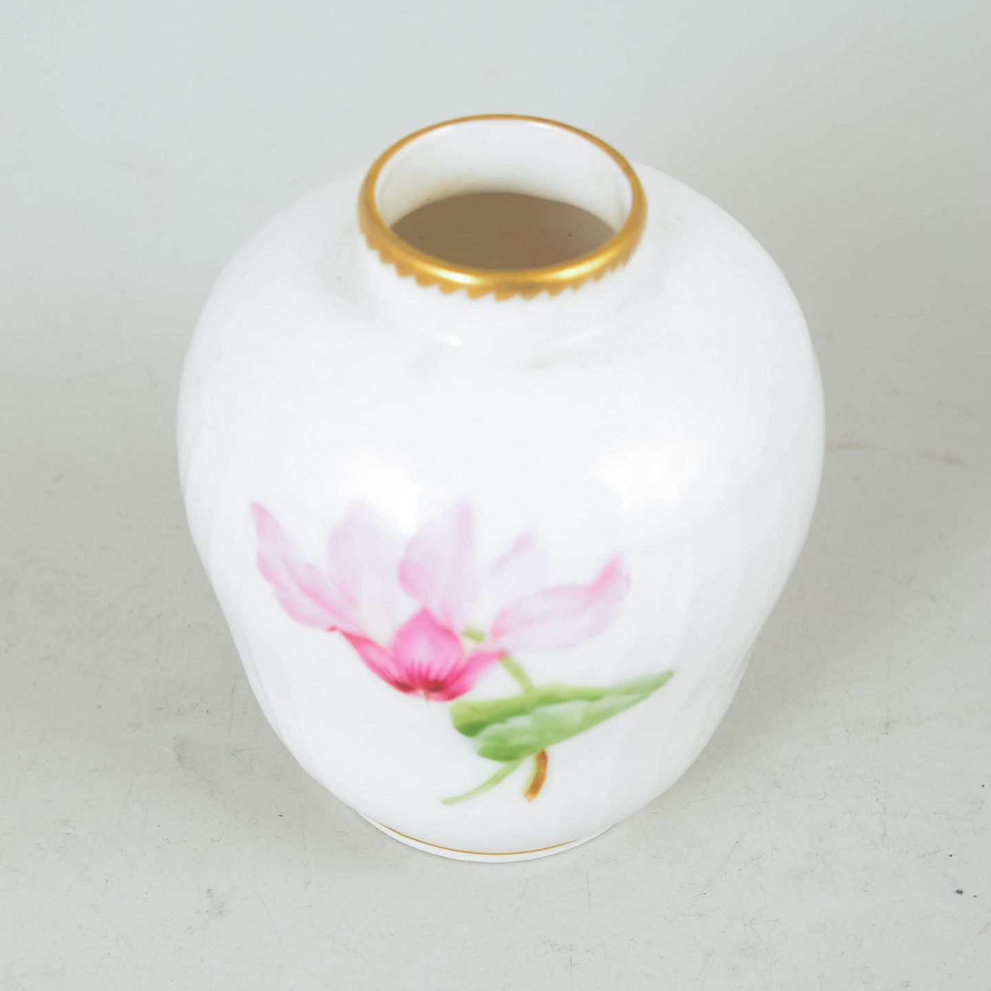 Håndmalet porcelænsvase med blomsterdekoration i Saksisk blomst på hvid glasur, afsluttet med forgyldt kant ved hals og fod. 1. sortering.
