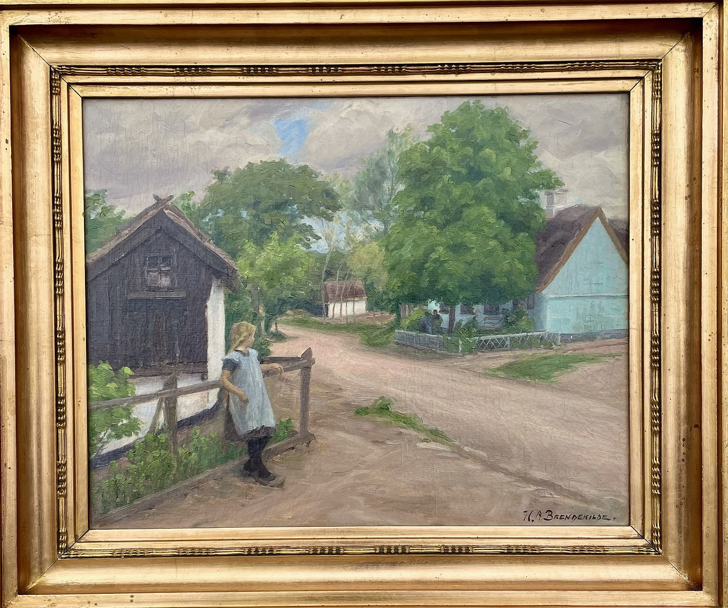 "Parti fra en landsby" Oliemaleri på lærred i forgyldt ramme. Maleriet er netop blevet renset og har fået slut fernis.