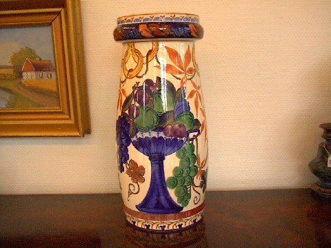 Dette er en stor og flot vase fra Aluminia dekoreret med Papegøje og frugtopsats. Højde 33 cm, dekorations nummer 571/554, enkelte små hårrevner.