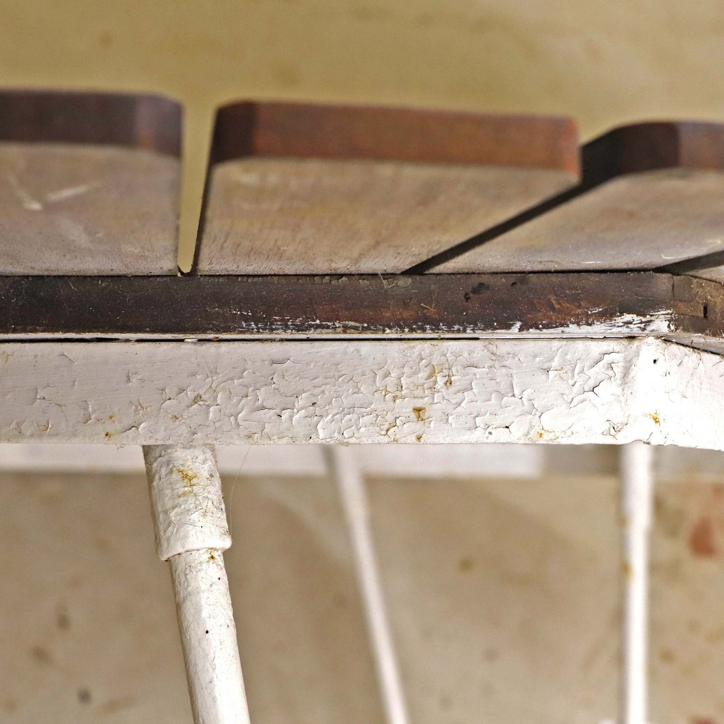 Rundt havebord fra år 1950-60 med nyrenoverede lameller i teaktræ med messingpynt på stel af hvidlakeret stålrør. Benene er ikke renoveret.