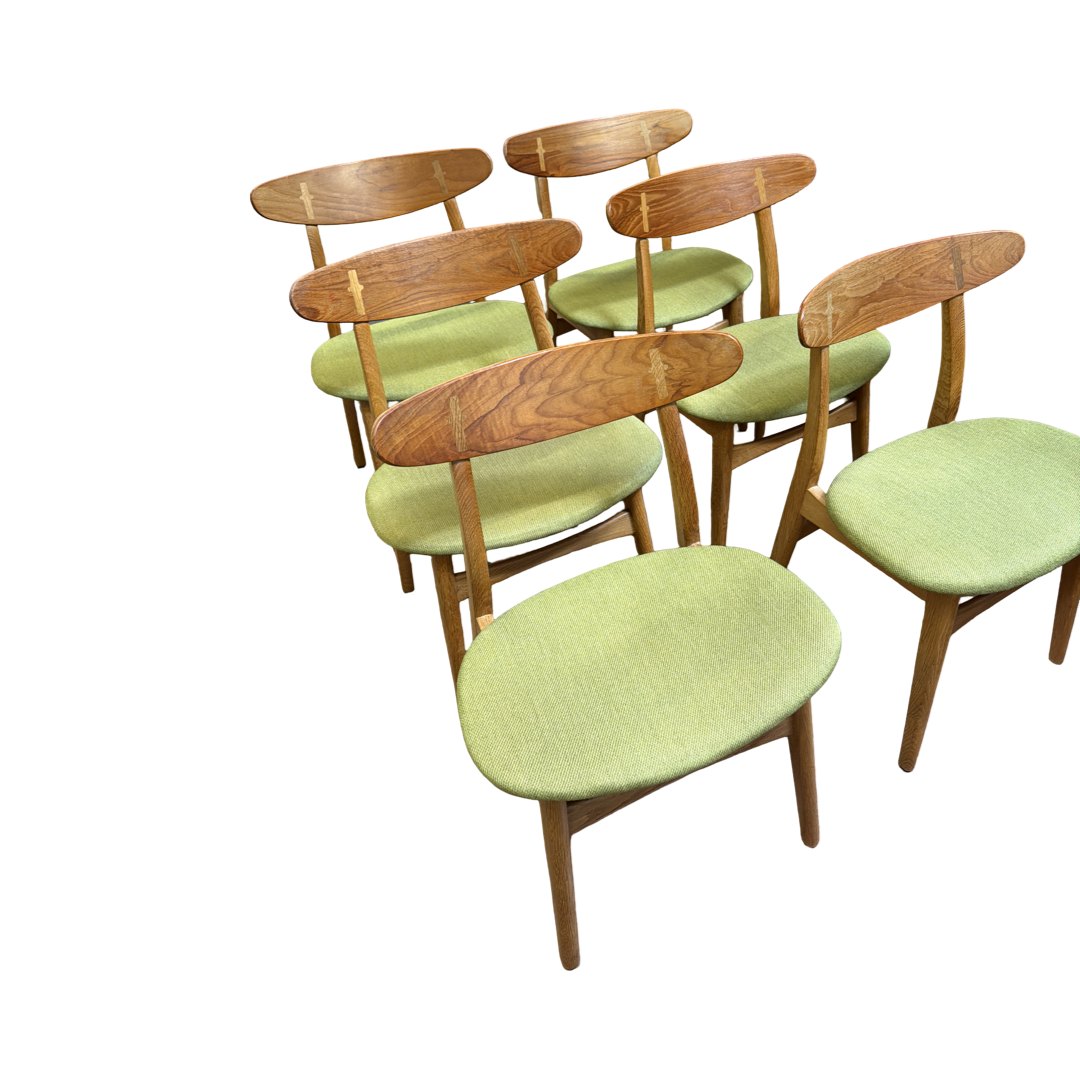 6 stk. Hans J. Wegner CH30 spisebordsstole udført i en smuk kombination af teak og eg – produceret af Carl Hansen & Søn, Odense.