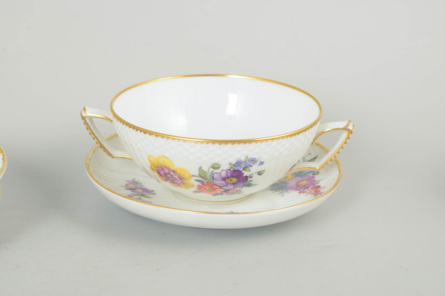 Sæt af fire bouillonkopper med tilhørende underkopper i porcelæn dekoreret med håndmalede blomster i saksisk blomst-mønster og afsluttet med forgyldt kant. Model 4/1872. 1. sortering.