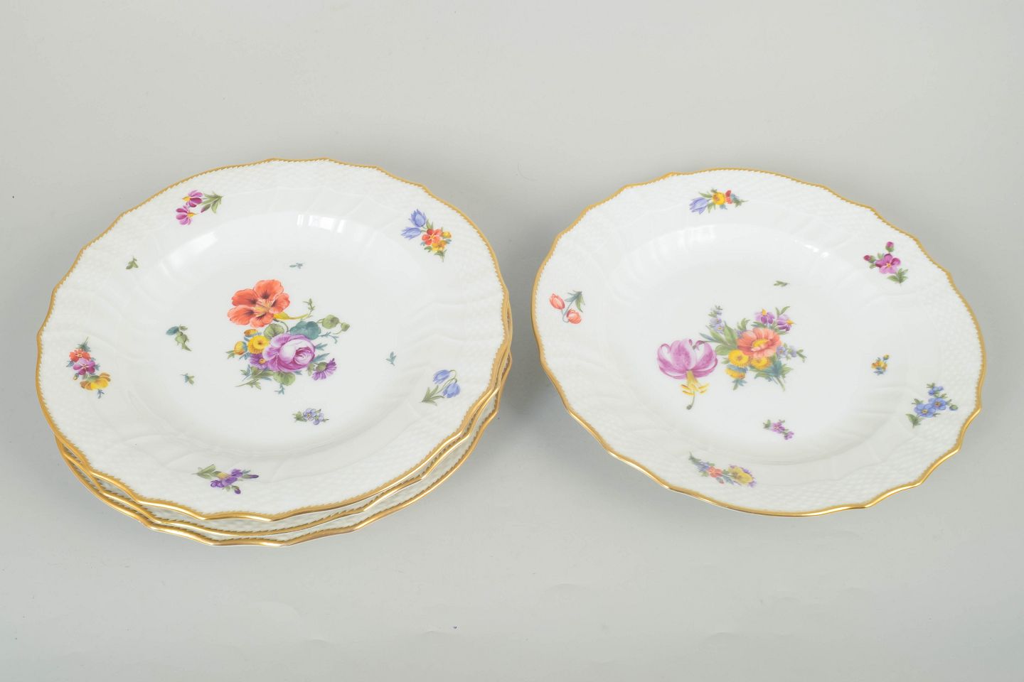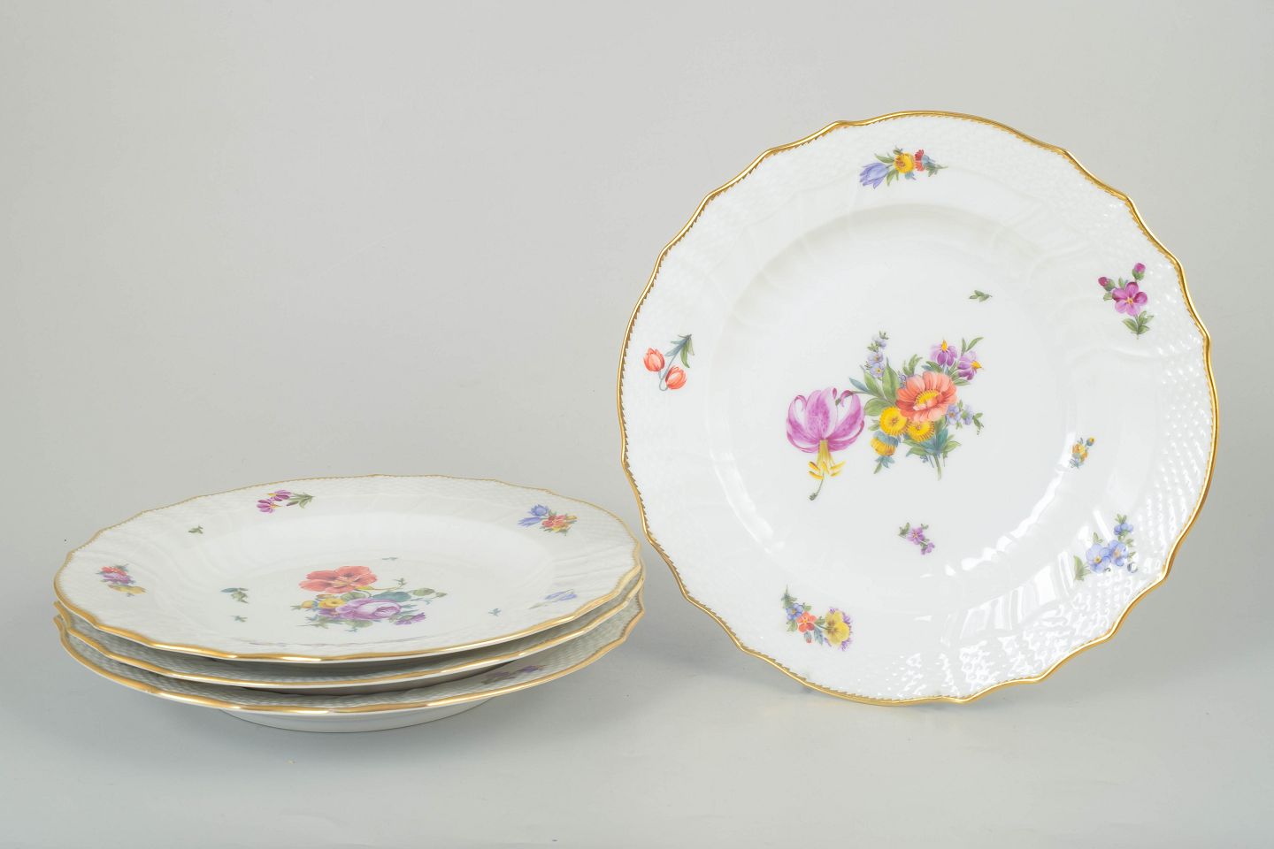 Elegant sæt af fire middagstallerkner i porcelæn dekoreret med håndmalede blomster i saksisk blomst-mønster og afsluttet med forgyldt kant. Model 4/1621. 1. sortering.