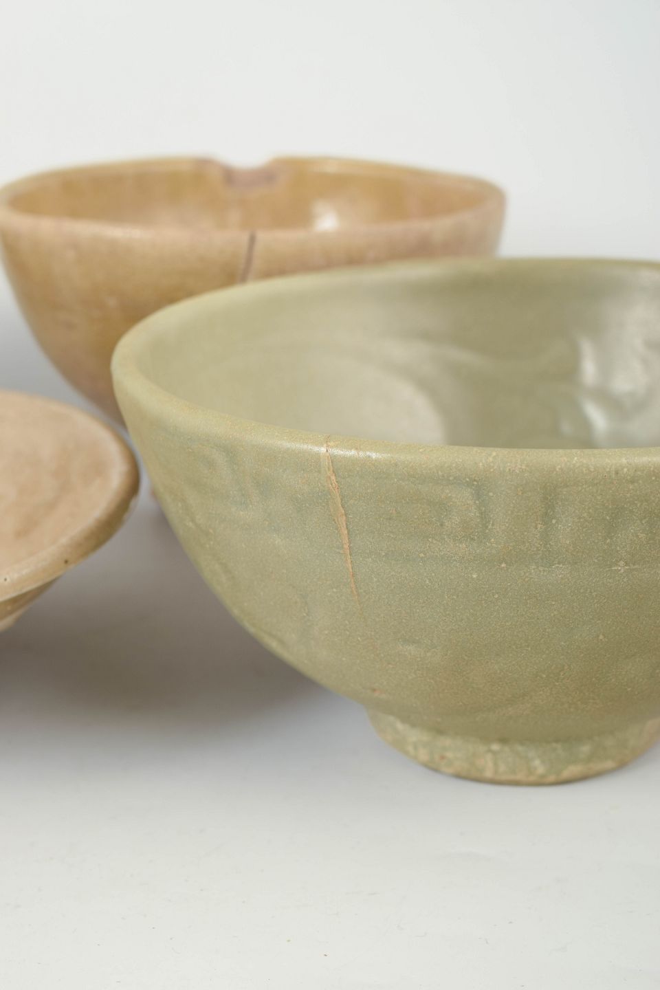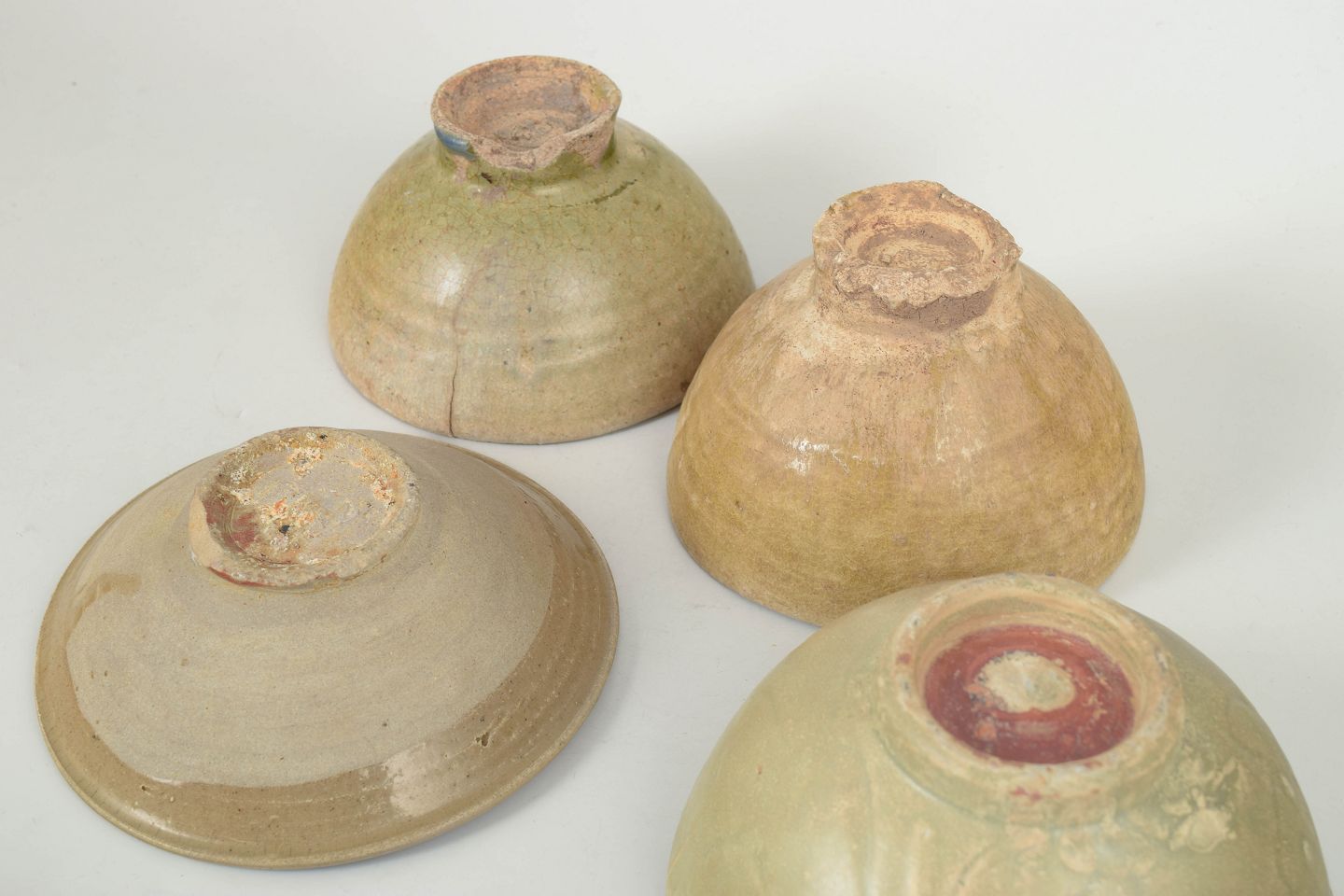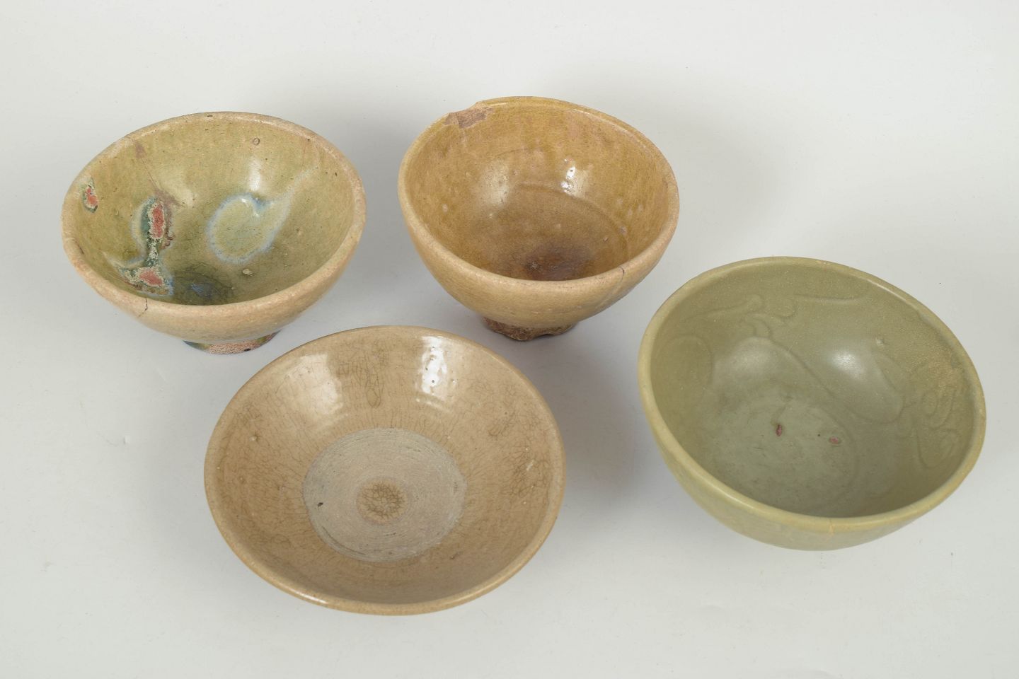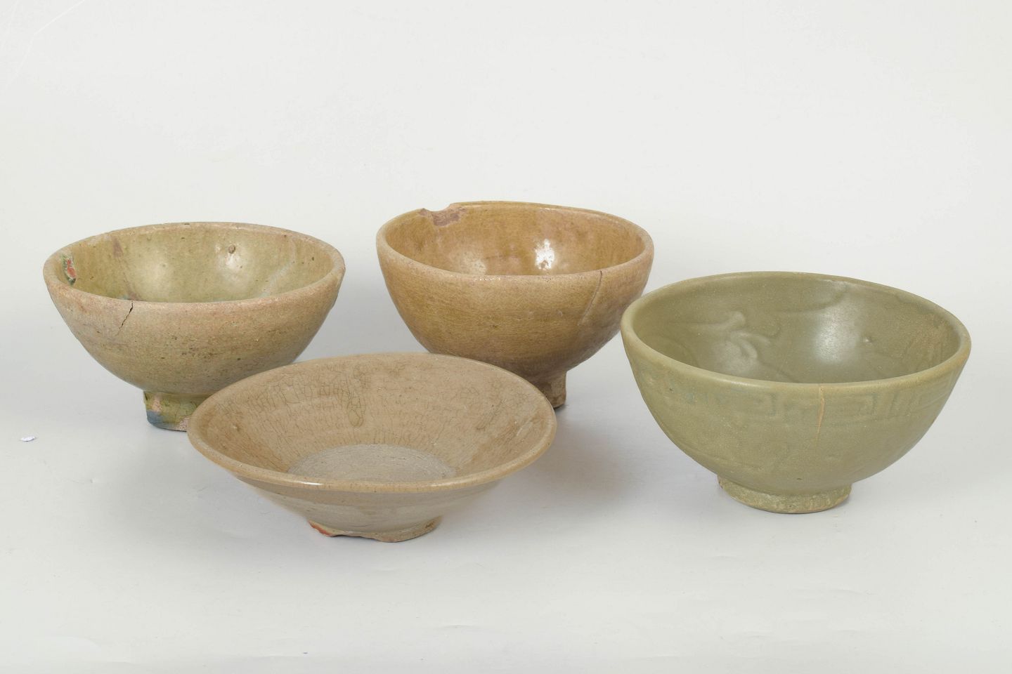 Four hand-thrown ceramic bowls with varying glazes, including celadon and earthy tones, showing visible age and use with traditional forms of the period.