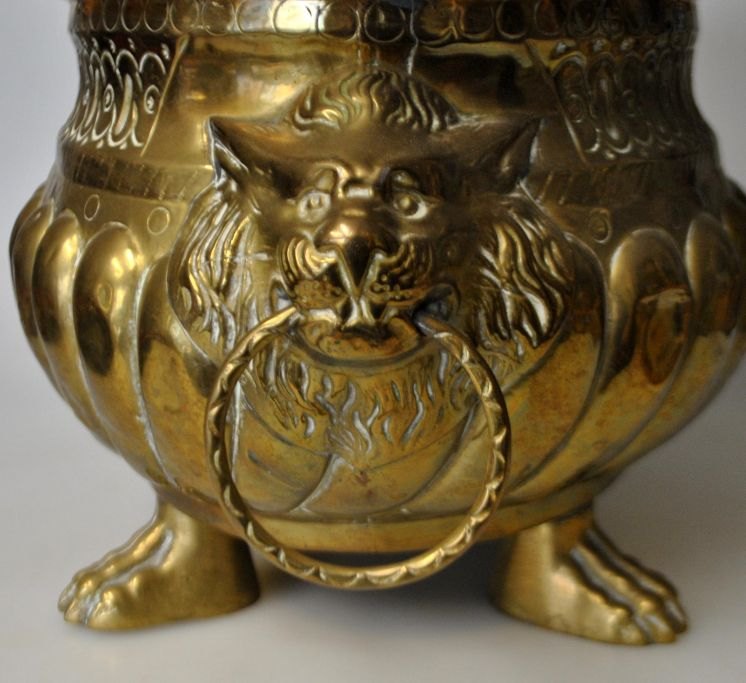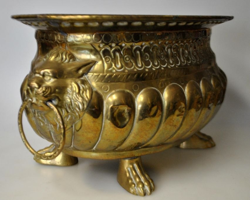 Danish flower pot cover in brass, 19th century. With lion feet. Decorated with two lion heads with rings in the mouth. H.: 17 cm. Dia.: 31 cm.