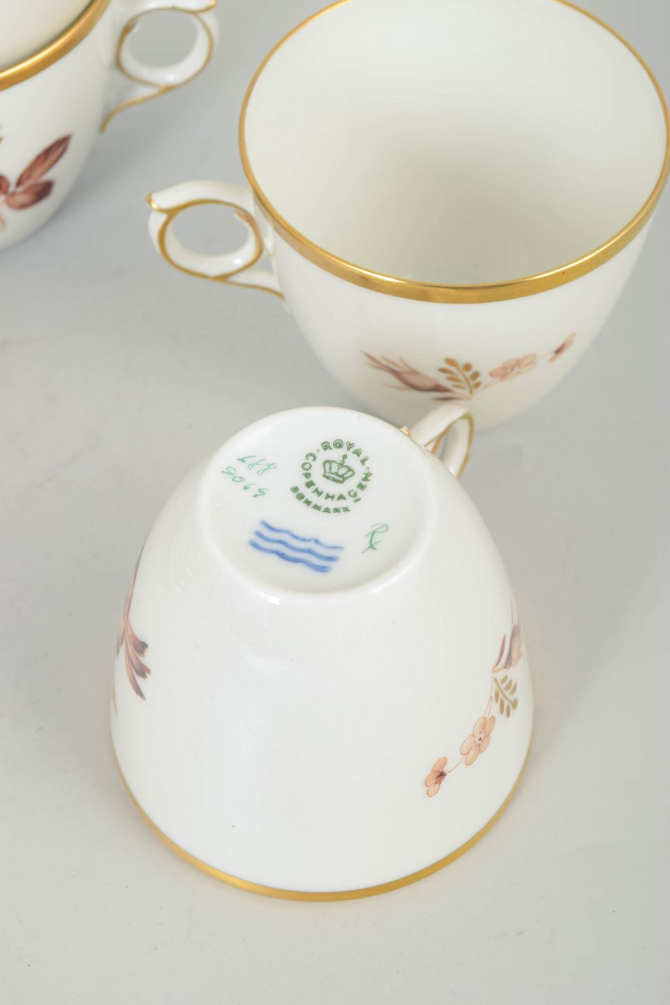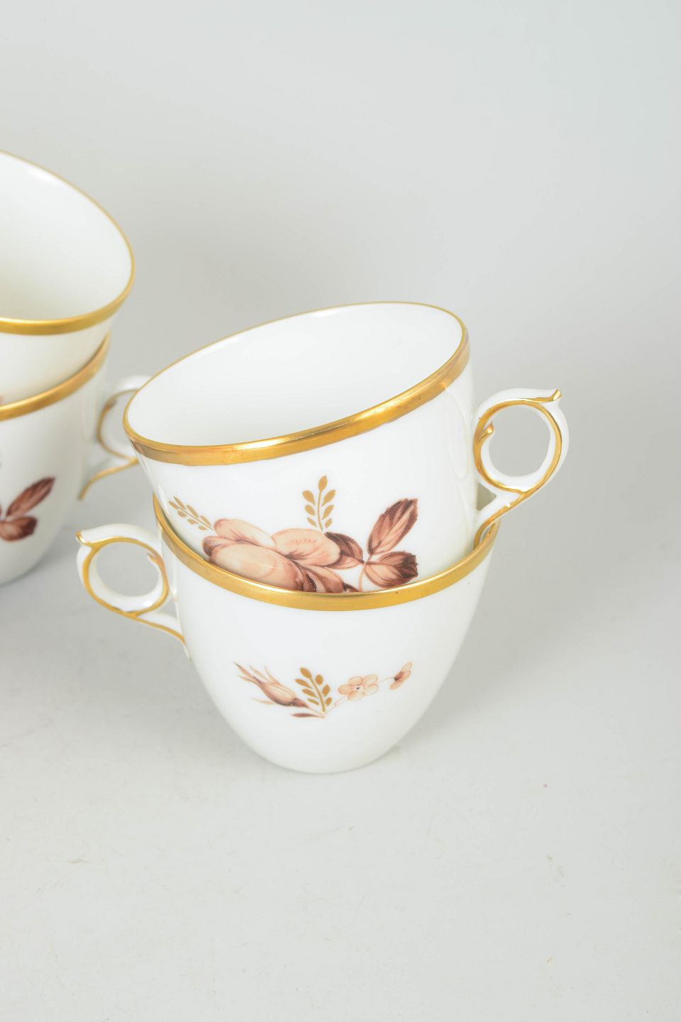 Elegant stel i hvidt porcelæn dekoreret med brun blomsterdekoration og guldkant. Model 688/9069. Første sortering.