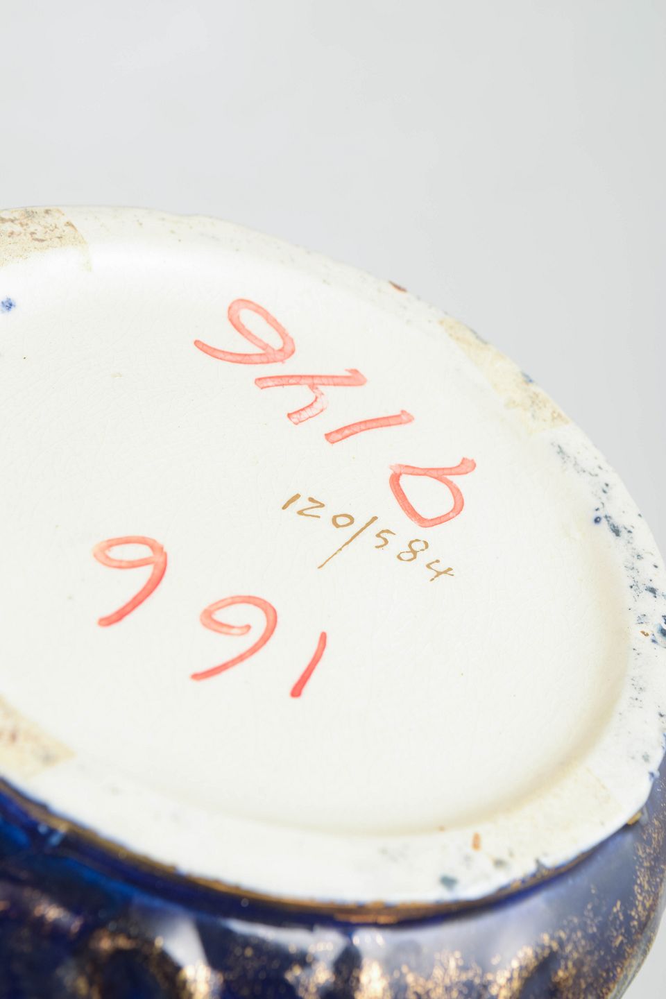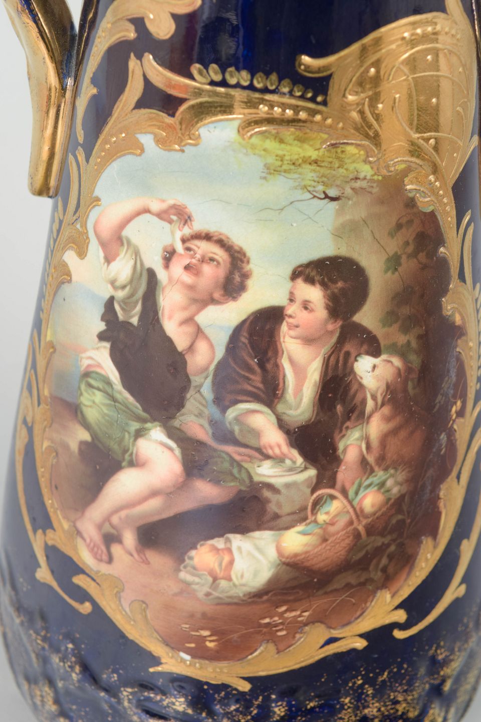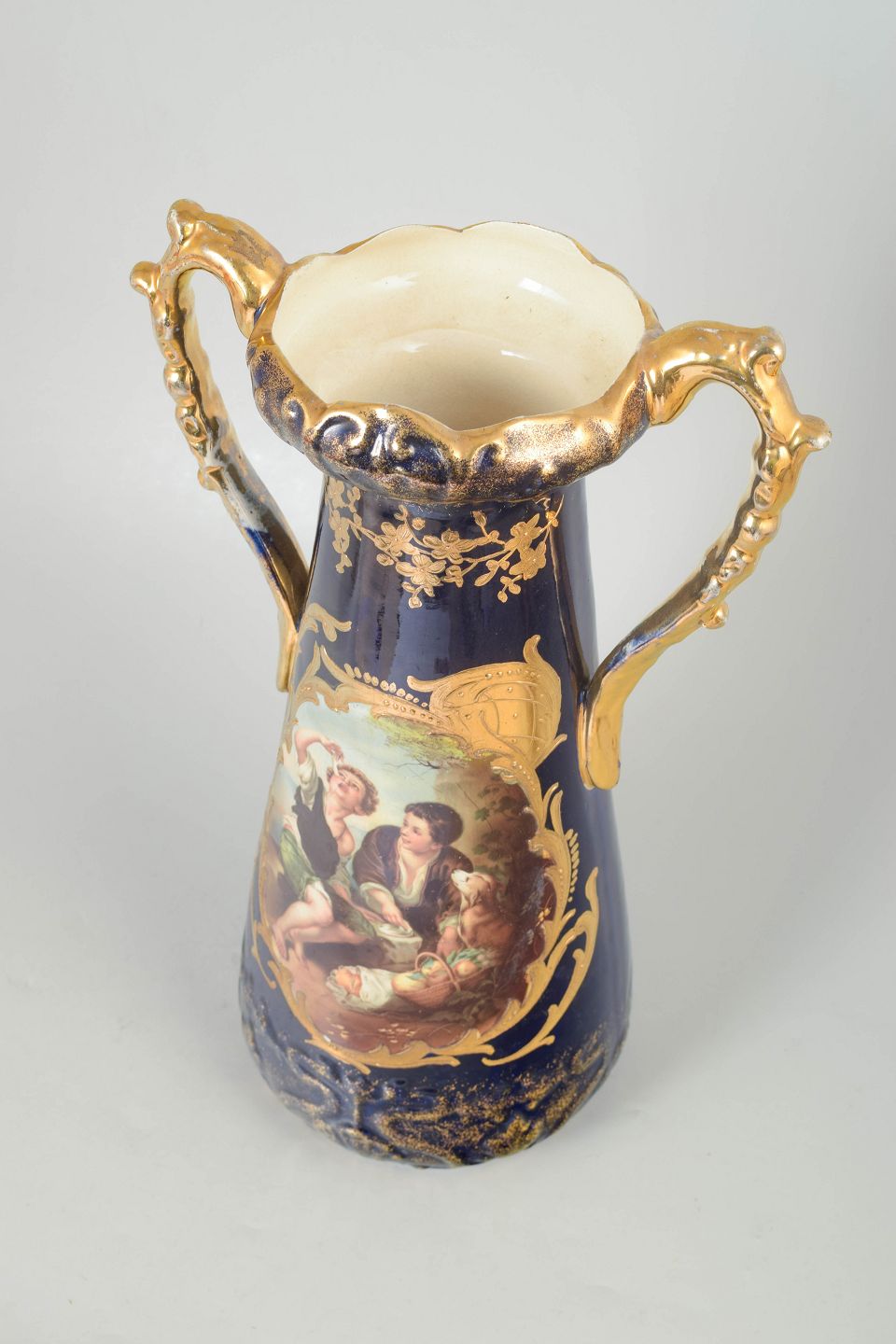 Tall baluster-shaped faience vase with deep cobalt blue glaze, richly decorated with gilded details and a central scene depicting figures in a classical style.