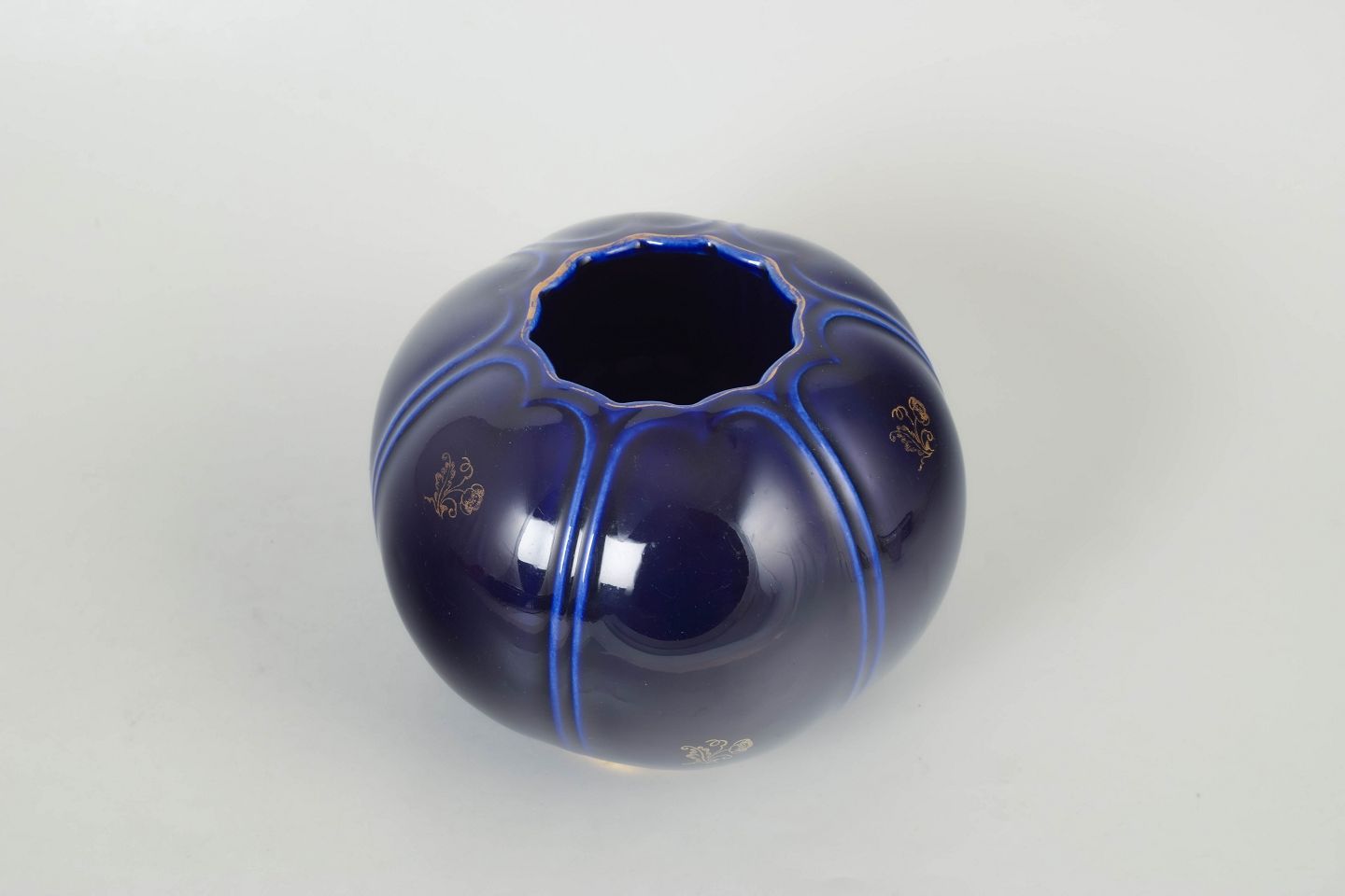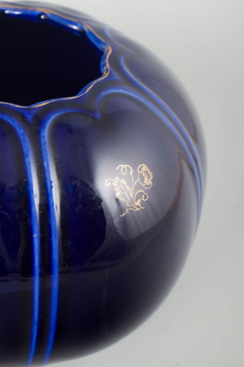 Spherical porcelain vase with a deep cobalt blue glaze, decorated with vertical lines and a gilded rim at the base.