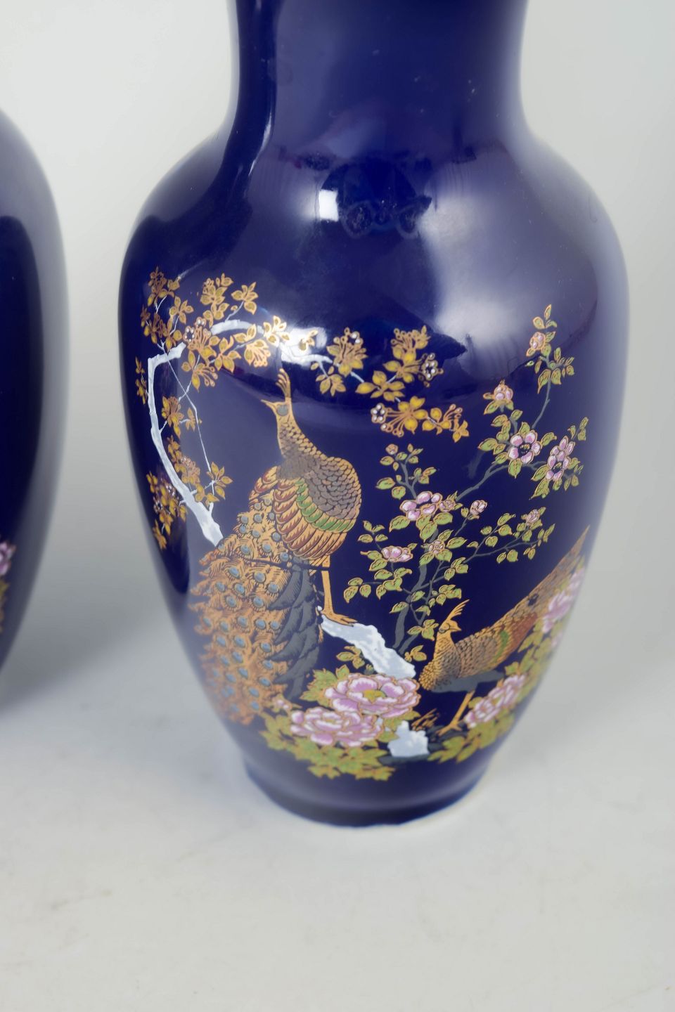 Elegant par vaser i glaseret porcelæn med dyb blå bundfarve og rigt dekorerede motiver af påfugle, blomster og natur i forgyldte og polykrome nuancer. Mærket med producentmærkat fra Japan på undersiden.