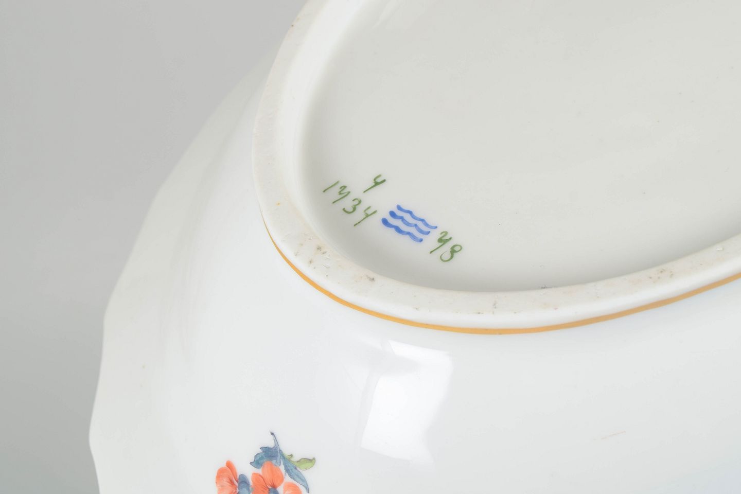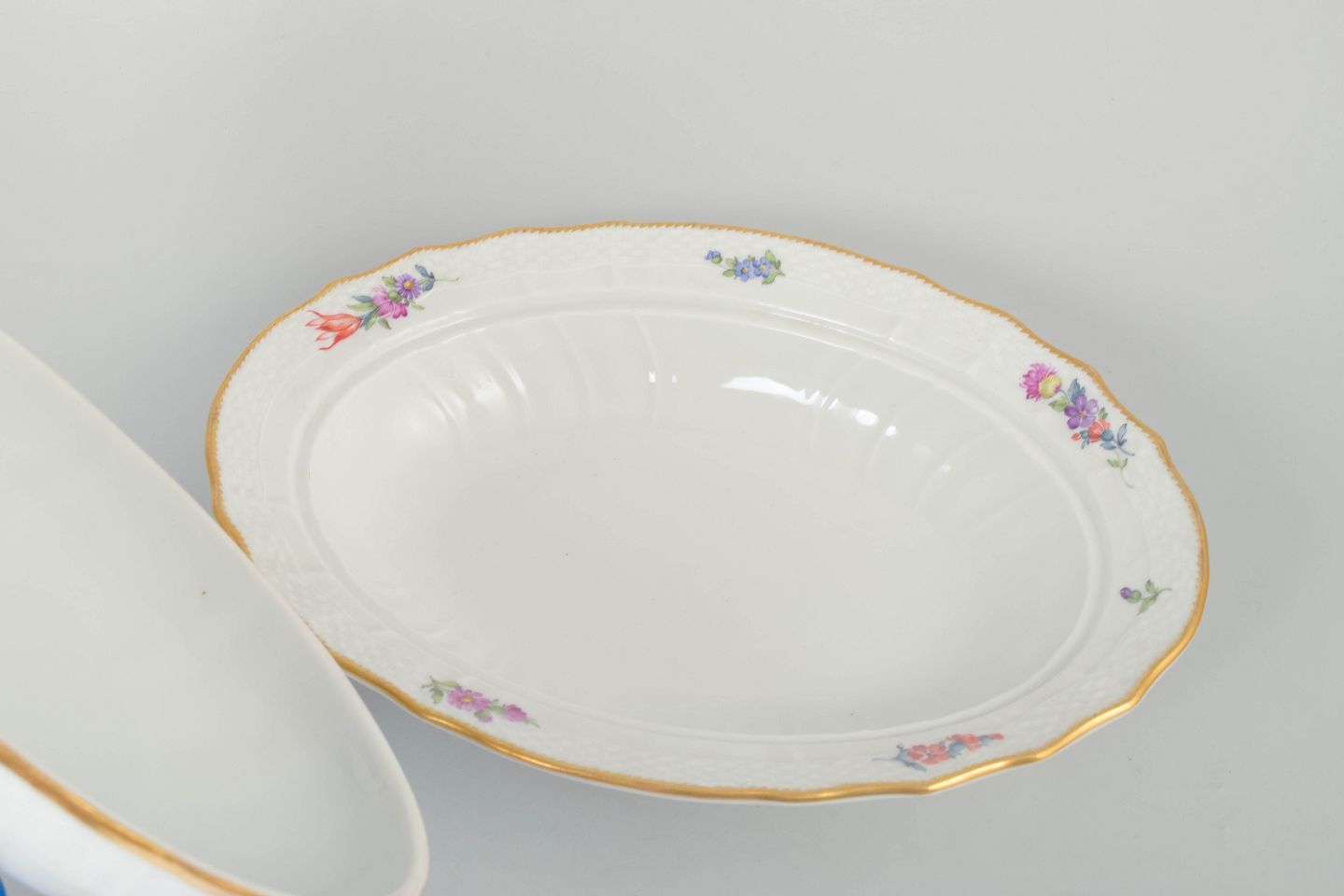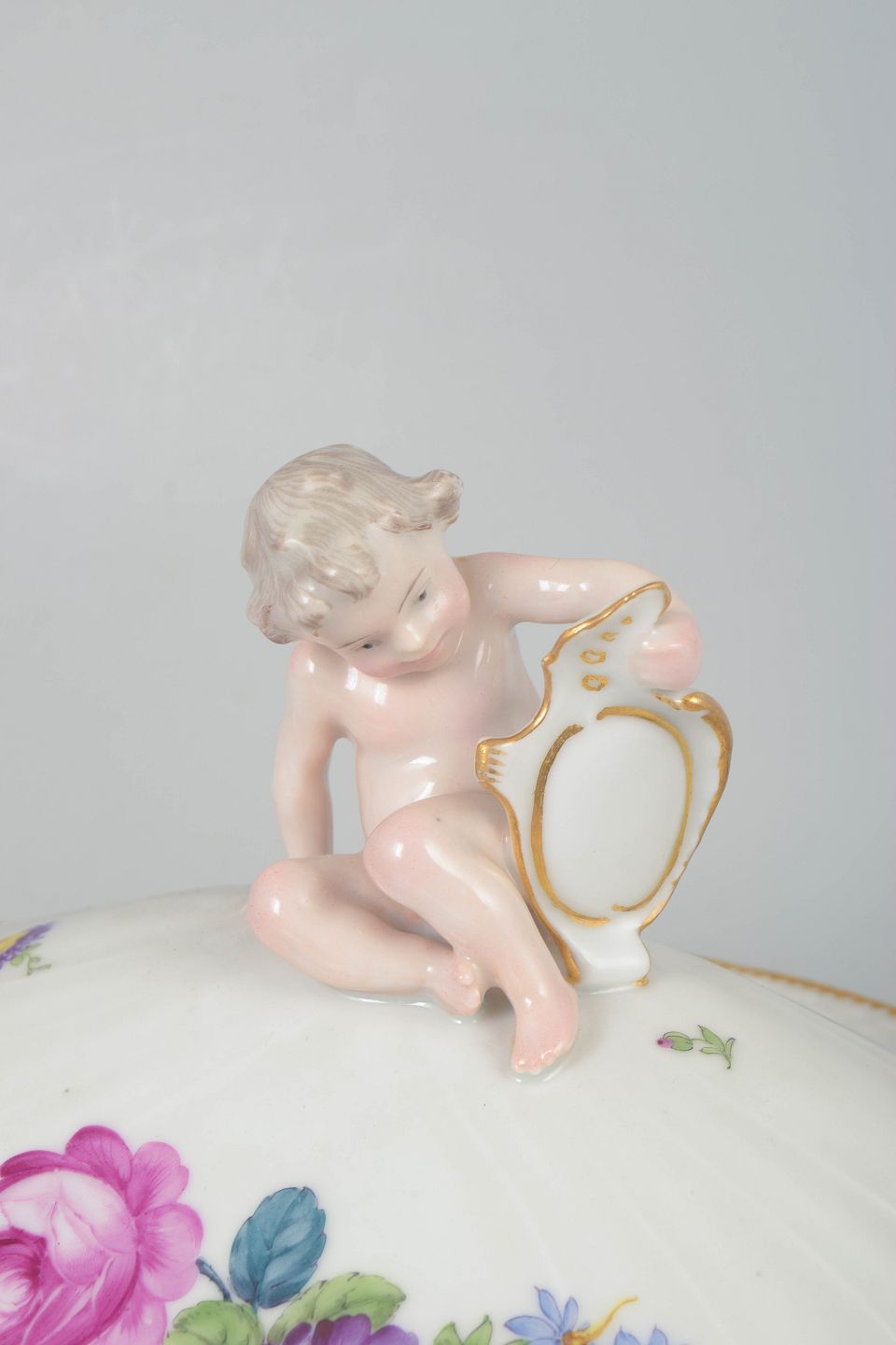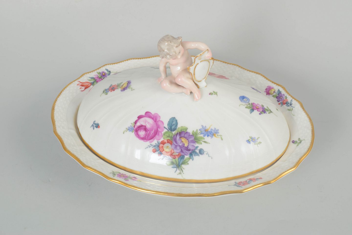 Stor oval lågskål i porcelæn med polykrom blomsterdekoration i saksisk blomst og guldkant. Låget afsluttet med knop formet som puttofigur. Model 4/1734.