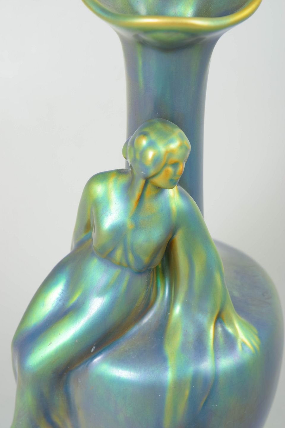 Art nouveau vase with integrated female figure in a flowing, organic form. Executed in the characteristic iridescent eosin glaze with shifting green, blue and golden tones.