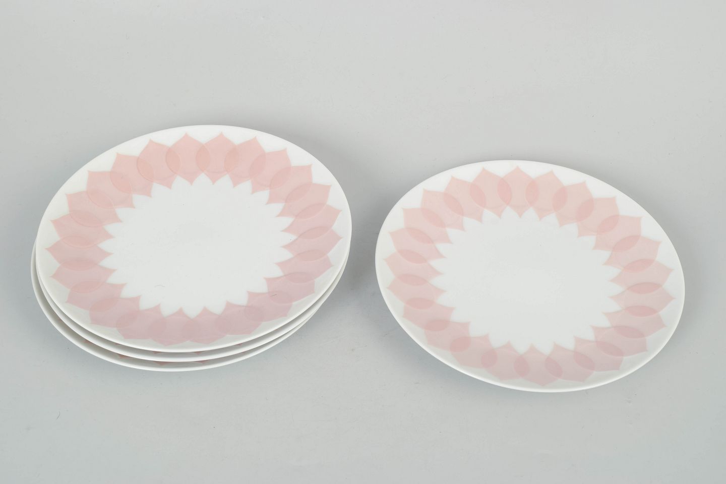 Fire tallerkener i porcelæn med rosa “Lotus” dekoration, udført med gentaget bladmotiv langs kanten i bløde nuancer og et karakteristisk dekorativt udtryk.