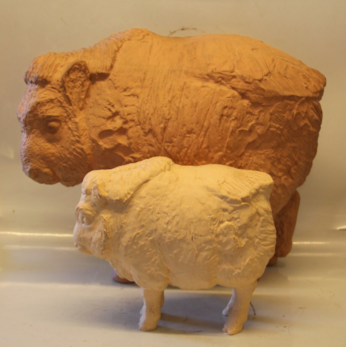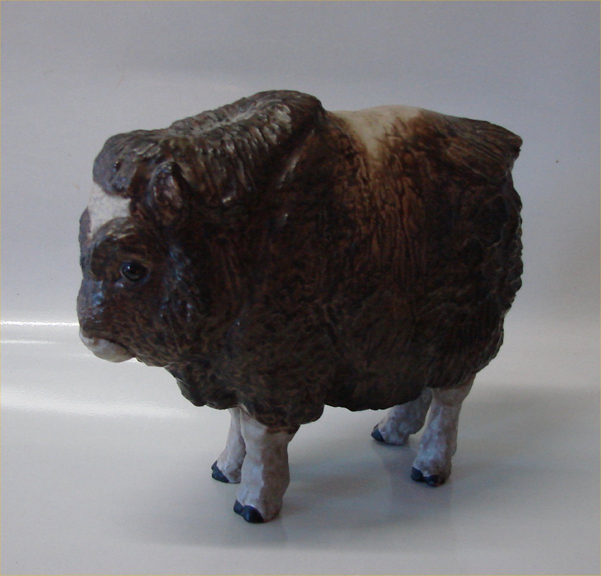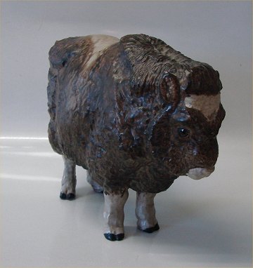 Small Aluminia Figurine 3149 RC Faience Musk Ox calf Jeanne Grut ca. 22 x 26 cm glazed