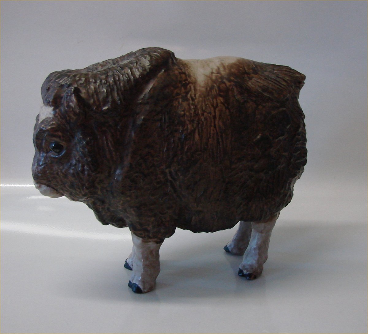 Royal Copenhagen Aluminia Faience figurine. 3149 RC Faience Musk Ox calf Jeanne Grut ca. 22 x 26 cm glazed Moskusokse